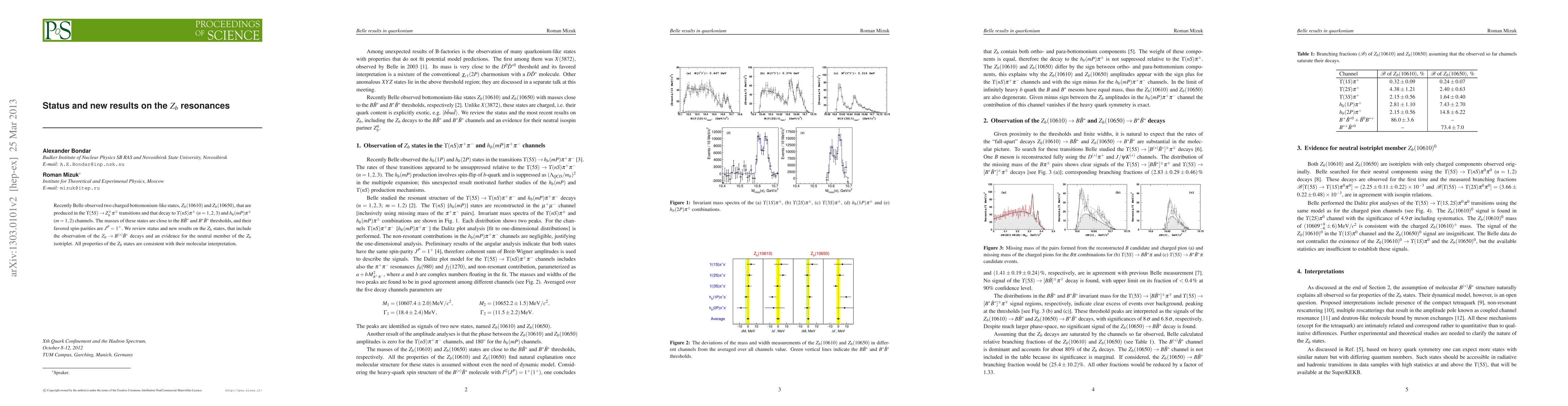 Recently Belle observed two charged bottomonium-like states, Zb(10610) and Zb(10650), that are produced in the Upsilon(5S) -> Zb pi transitions and that decay to Upsilon(nS) pi (n=1,2,3) and h_b(mP) pi (m=1,2) channels. The masses of these states are close to the $B\bar{B}^*$ and $B^*\bar{B}^*$ thresholds, and their favored spin-parities are $J^P=1^+$. We review status and new results on the Zb states, that include the observation of the $Z_b\to B^{(*)}\bar{B}^*$ decays and an evidence for the neutral member of the Zb isotriplet. All properties of the Zb states are consistent with their molecular interpretation.