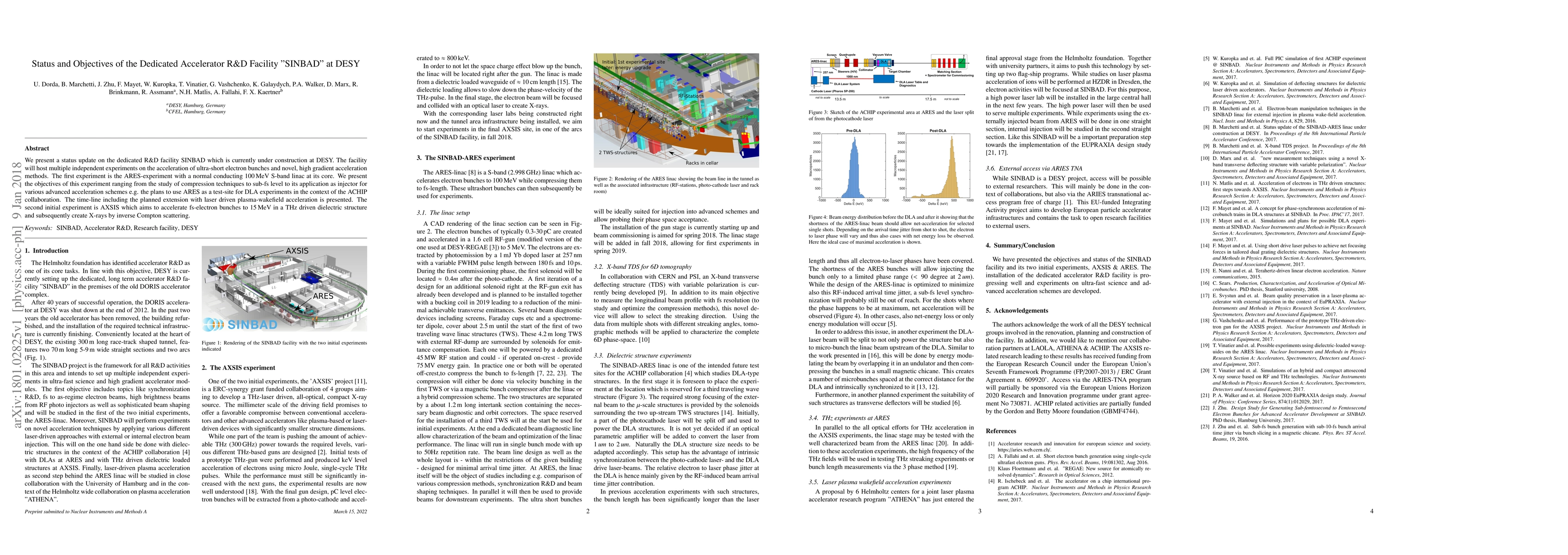We present a status update on the dedicated R\&D facility SINBAD which is currently under construction at DESY. The facility will host multiple independent experiments on the acceleration of ultra-short electron bunches and novel, high gradient acceleration methods. The first experiment is the ARES-experiment with a normal conducting 100\,MeV S-band linac at its core. We present the objectives of this experiment ranging from the study of compression techniques to sub-fs level to its application as injector for various advanced acceleration schemes e.g. the plans to use ARES as a test-site for DLA experiments in the context of the ACHIP collaboration. The time-line including the planned extension with laser driven plasma-wakefield acceleration is presented. The second initial experiment is AXSIS which aims to accelerate fs-electron bunches to 15\,MeV in a THz driven dielectric structure and subsequently create X-rays by inverse Compton scattering.