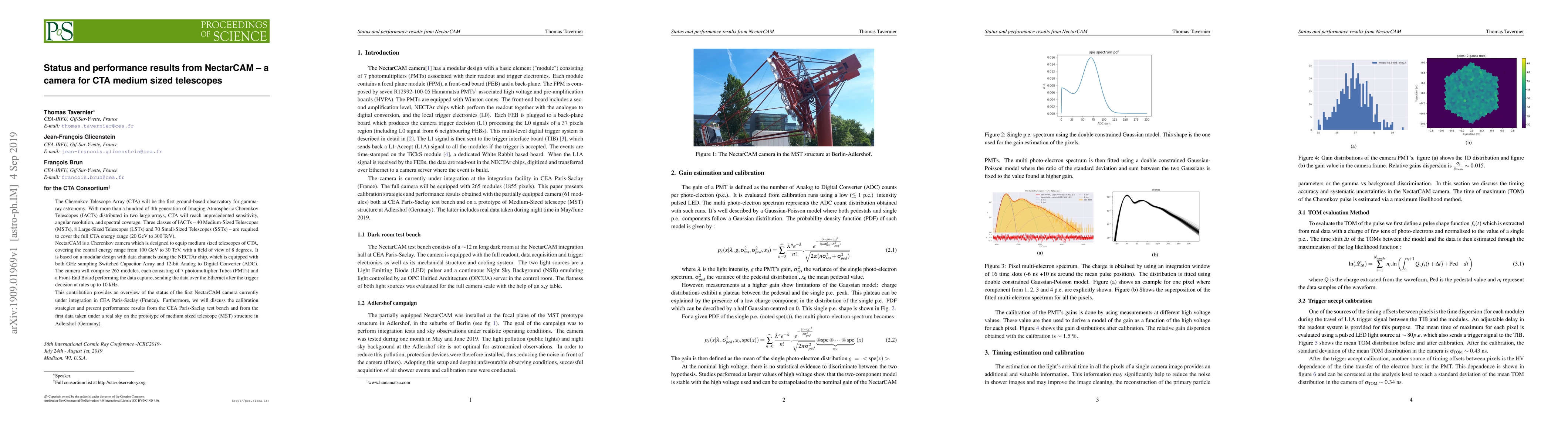 The Cherenkov Telescope Array (CTA) will be the first ground-based observatory for gamma-ray astronomy. With more than a hundred of 4th generation of Imaging Atmospheric Cherenkov Telescopes (IACTs) distributed in two large arrays, CTA will reach unprecedented sensitivity, angular resolution, and spectral coverage. Three classes of IACTs -- 40 Medium-Sized Telescopes (MSTs), 8 Large-Sized Telescopes (LSTs) and 70 Small-Sized Telescopes (SSTs) -- are required to cover the full CTA energy range (20 GeV to 300 TeV). NectarCAM is a Cherenkov camera which is designed to equip medium sized telescopes of CTA, covering the central energy range from 100 GeV to 30 TeV, with a field of view of 8 degrees. It is based on a modular design with data channels using the NECTAr chip, which is equipped with both GHz sampling Switched Capacitor Array and 12-bit Analog to Digital Converter (ADC). The camera will comprise 265 modules, each consisting of 7 photomultiplier Tubes (PMTs) and a Front-End Board performing the data capture, sending the data over the Ethernet after the trigger decision at rates up to 10 kHz. This contribution provides an overview of the status of the first NectarCAM camera currently under integration in CEA Paris-Saclay (France). Furthermore, we will discuss the calibration strategies and present performance results from the CEA Paris-Saclay test bench and from the first data taken under a real sky on the prototype of medium sized telescope (MST) structure in Adlershof (Germany).