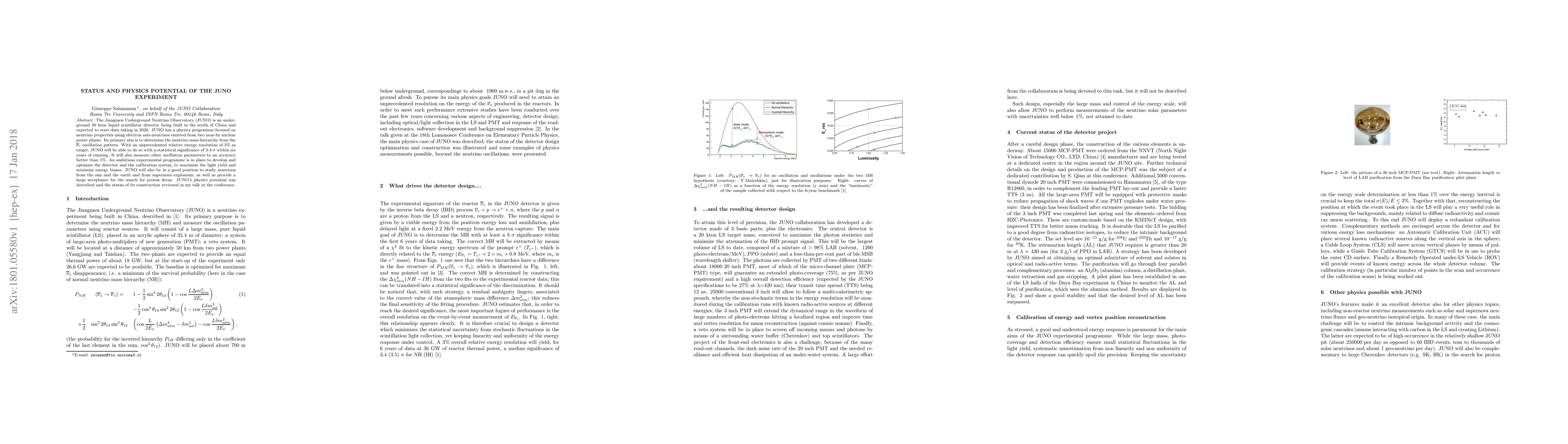 The JUNO experiment, a 20 kton liquid scintillator detector in China, aims to determine the neutrino mass hierarchy with a 3% energy resolution and a 3-4 σ significance within six years. It also plans to measure other oscillation parameters and explore neutrinos from various sources.