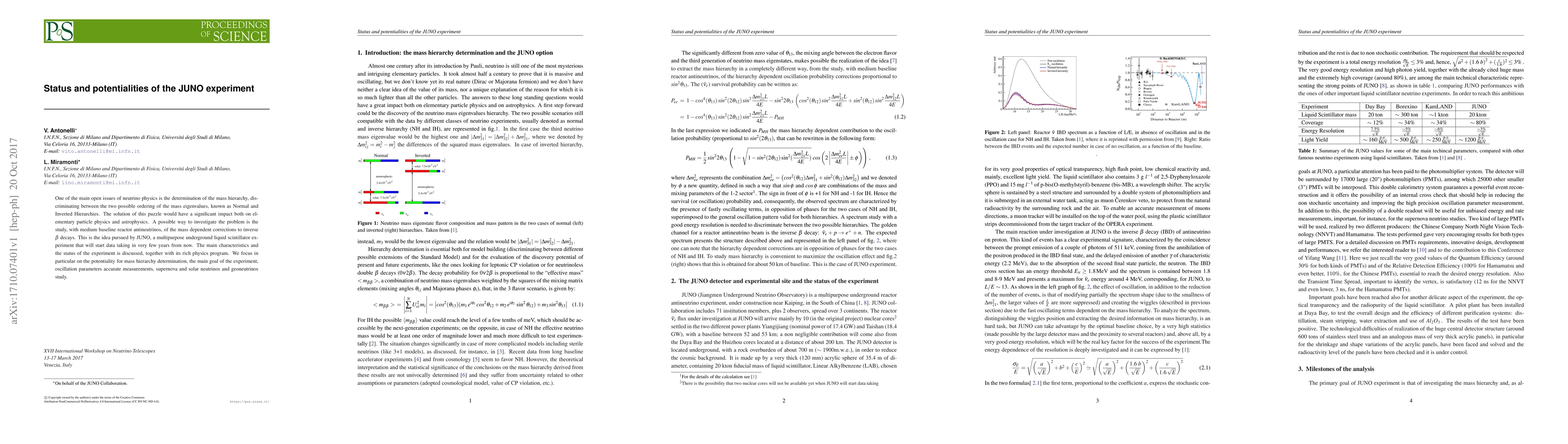 The JUNO experiment aims to determine the neutrino mass hierarchy using medium baseline reactor antineutrinos, with a focus on precise measurements of oscillation parameters and studies of supernova, solar, and geoneutrinos. The current status and future potential of the experiment are discussed, highlighting its pivotal role in advancing neutrino physics and astrophysics.