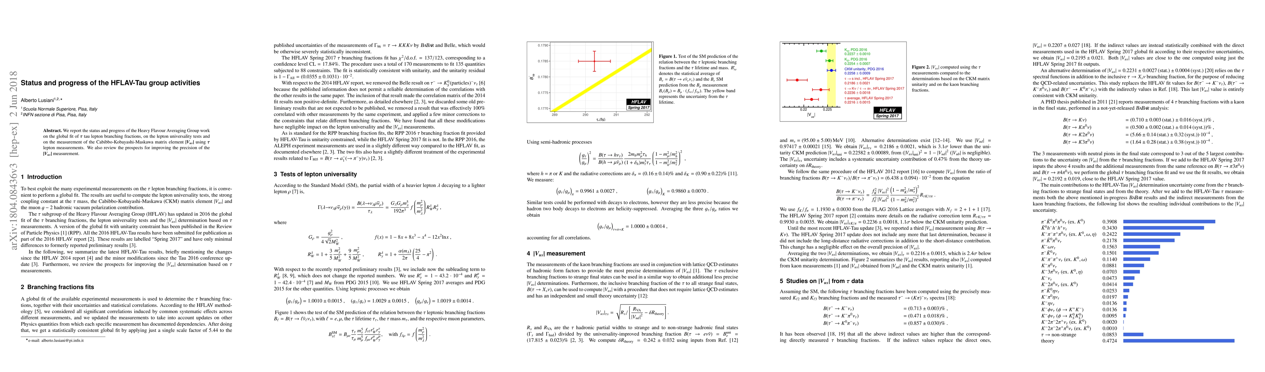 The research reports on the status and progress of the Heavy Flavour Averaging Group (HFLAV-Tau) activities, focusing on global fits of tau lepton branching fractions, lepton universality tests, and measurement of the Cabibbo-Kobayashi-Maskawa (CKM) matrix element |Vus| using tau lepton measurements.