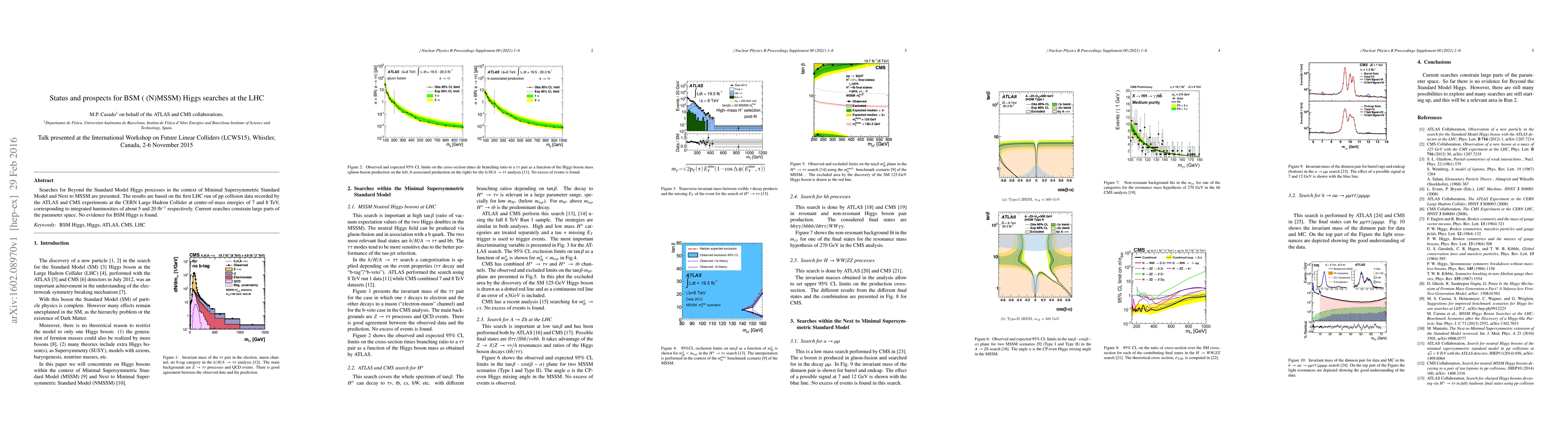 Current LHC searches for Beyond Standard Model Higgs processes rule out large parts of the Minimal Supersymmetric Standard Model and Next to MSSM parameter space with no evidence found.