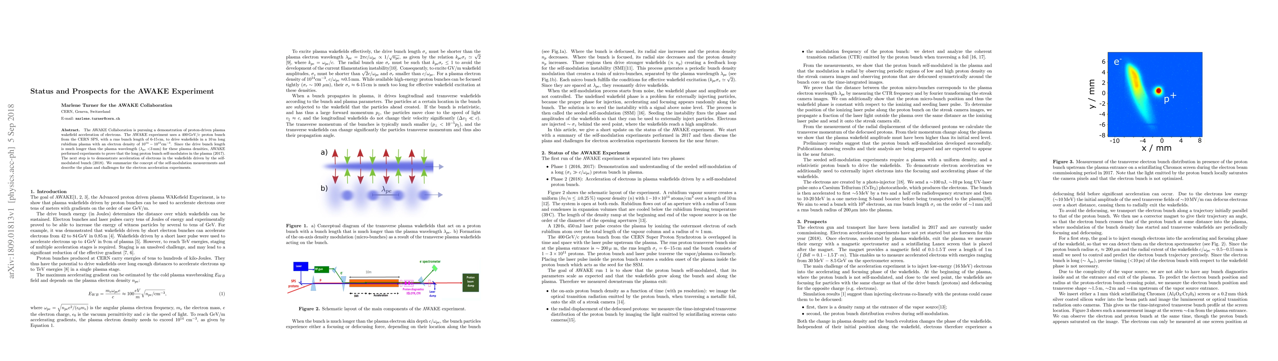 The AWAKE Collaboration is pursuing a demonstration of proton-driven plasma wakefield acceleration of electrons. The AWAKE experiment uses a \SI{400}{GeV/c} proton bunch from the CERN SPS, with a rms bunch length of $6$-\SI{15}{cm}, to drive wakefields in a \SI{10}{m} long rubidium plasma with an electron density of $10^{14}-10^{15}$cm$^{-3}$. Since the drive bunch length is much longer than the plasma wavelength ($\lambda_{pe}<$\SI{3}{mm}) for these plasma densities, AWAKE performed experiments to prove that the long proton bunch self-modulates in the plasma (2017). The next step is to demonstrate acceleration of electrons in the wakefields driven by the self-modulated bunch (2018). We summarize the concept of the self-modulation measurements and describe the plans and challenges for the electron acceleration experiments.