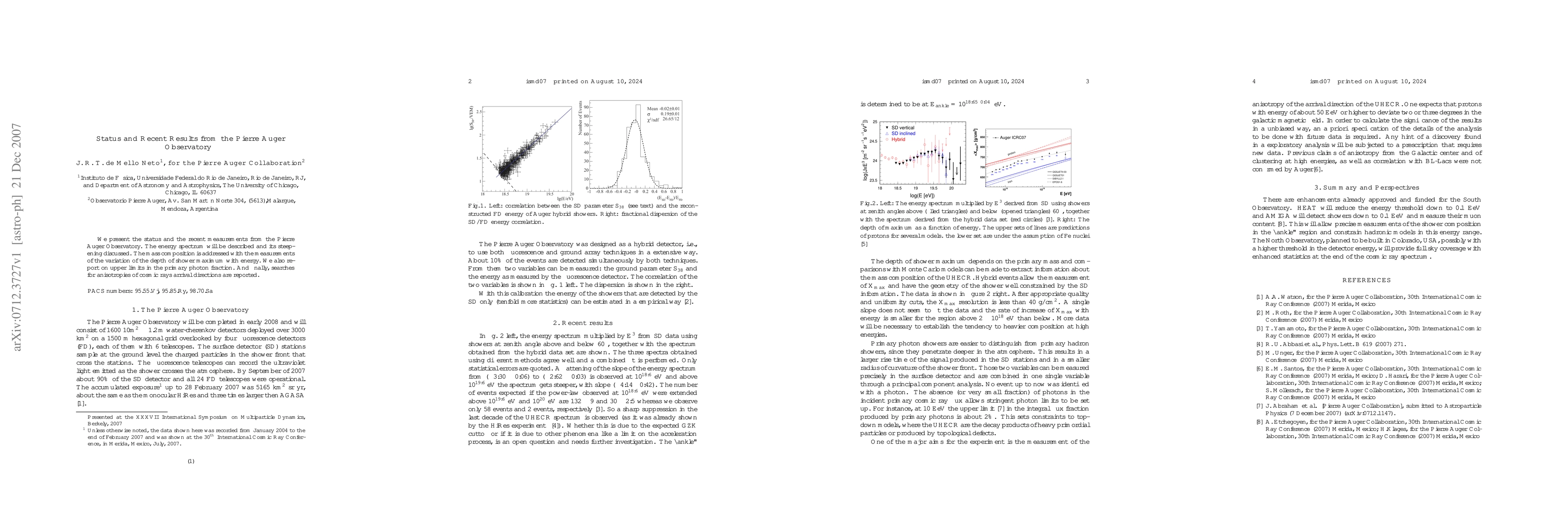 The Pierre Auger Observatory reports on its recent measurements, detailing the steepening energy spectrum and mass composition analysis through shower maximum depth. Additionally, it discusses upper limits on the primary photon fraction and searches for cosmic ray arrival direction anisotropies.