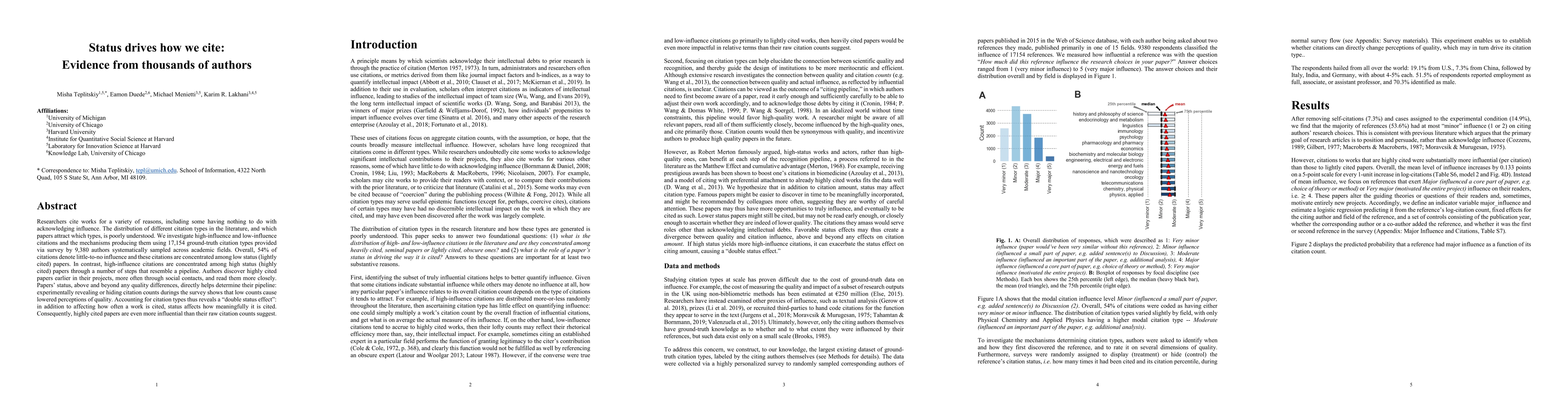 Researchers cite works for a variety of reasons, including some having nothing to do with acknowledging influence. The distribution of different citation types in the literature, and which papers attract which types, is poorly understood. We investigate high-influence and low-influence citations and the mechanisms producing them using 17,154 ground-truth citation types provided via survey by 9,380 authors systematically sampled across academic fields. Overall, 54% of citations denote little-to-no influence and these citations are concentrated among low status (lightly cited) papers. In contrast, high-influence citations are concentrated among high status (highly cited) papers through a number of steps that resemble a pipeline. Authors discover highly cited papers earlier in their projects, more often through social contacts, and read them more closely. Papers' status, above and beyond any quality differences, directly helps determine their pipeline: experimentally revealing or hiding citation counts during the survey shows that low counts cause lowered perceptions of quality. Accounting for citation types thus reveals a "double status effect": in addition to affecting how often a work is cited, status affects how meaningfully it is cited. Consequently, highly cited papers are even more influential than their raw citation counts suggest.