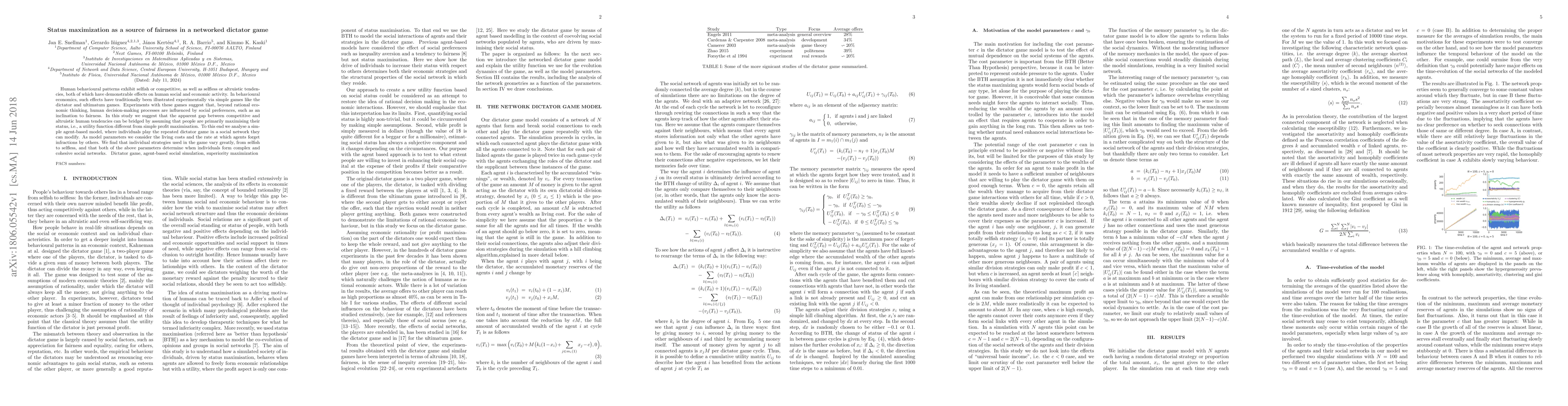 This paper explores how status maximization influences fairness in a networked dictator game, suggesting that individuals' decisions are driven by a desire to maximize their social status rather than just profit. The study uses an agent-based model to show that varying living costs and the rate of social forgiveness affect the formation of cohesive social networks and the balance between selfish and altruistic behaviors.
