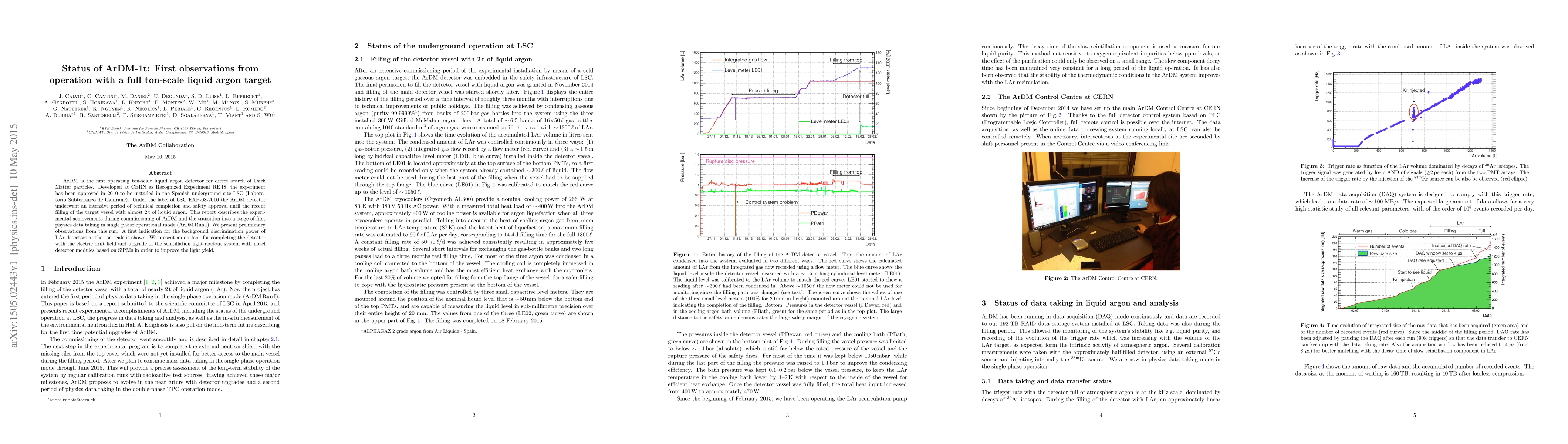 This paper reports on the first operational observations of ArDM-1t, a ton-scale liquid argon detector for direct dark matter searches, highlighting preliminary background discrimination results and outlining future upgrades to enhance its performance.