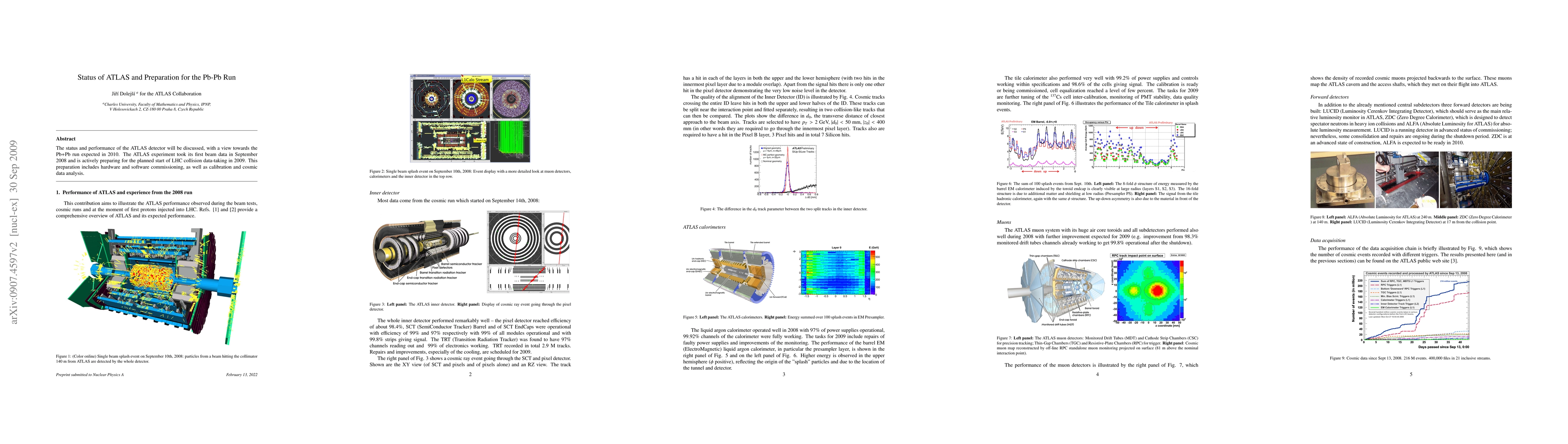 The ATLAS experiment collected initial beam data in 2008 and is gearing up for LHC collision data-taking in 2009, focusing on hardware and software commissioning, calibration, and cosmic data analysis. The paper discusses the current status and performance of the ATLAS detector in preparation for the Pb+Pb run anticipated in 2010.