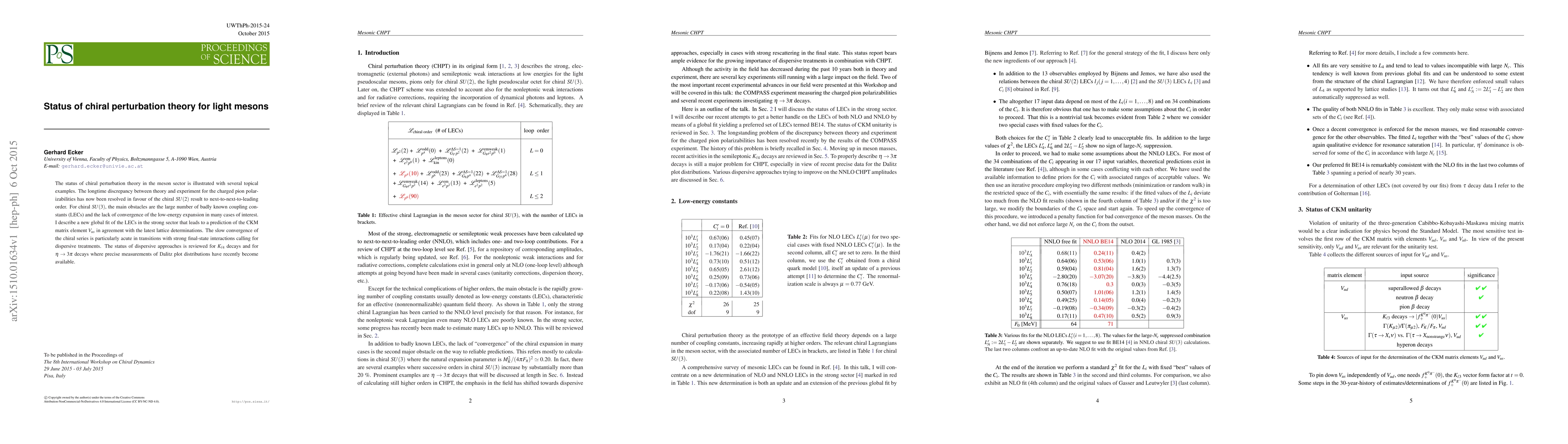 This paper reviews the current state of chiral perturbation theory in the meson sector, highlighting the resolution of discrepancies in pion polarizabilities and addressing challenges in chiral SU(3) due to unknown coupling constants and convergence issues. It also presents a new global fit of these constants, predicting $V_{us}$ in agreement with lattice determinations, and reviews dispersive approaches for $K_{\ell 4}$ and $\eta -> 3 \pi$ decays.