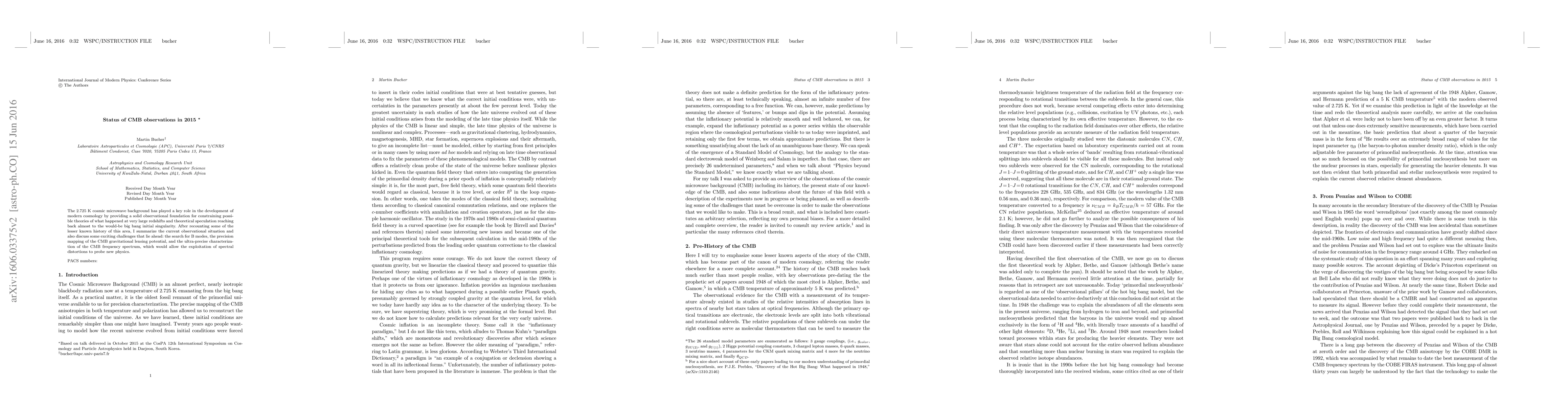 The 2.725 K cosmic microwave background has played a key role in the development of modern cosmology by providing a solid observational foundation for constraining possible theories of what happened at very large redshifts and theoretical speculation reaching back almost to the would-be big bang initial singularity. After recounting some of the lesser known history of this area, I summarize the current observational situation and also discuss some exciting challenges that lie ahead: the search for B modes, the precision mapping of the CMB gravitational lensing potential, and the ultra-precise characterization of the CMB frequency spectrum, which would allow the exploitation of spectral distortions to probe new physics.
