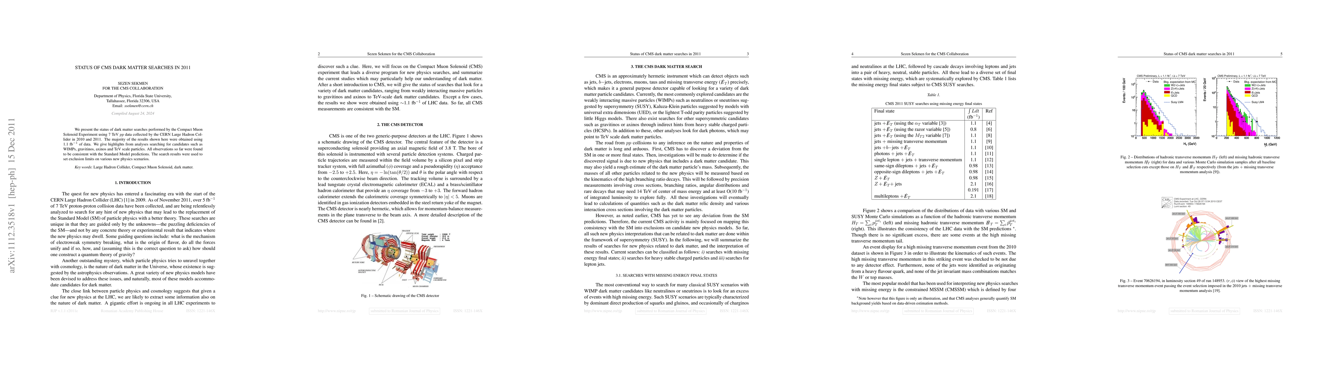 The CMS experiment reports on dark matter searches using 7 TeV proton-proton collision data from 2010 and 2011, with a focus on WIMPs, gravitinos, axinos, and other TeV scale particles. No deviations from Standard Model predictions were observed, leading to new exclusion limits on various new physics scenarios.