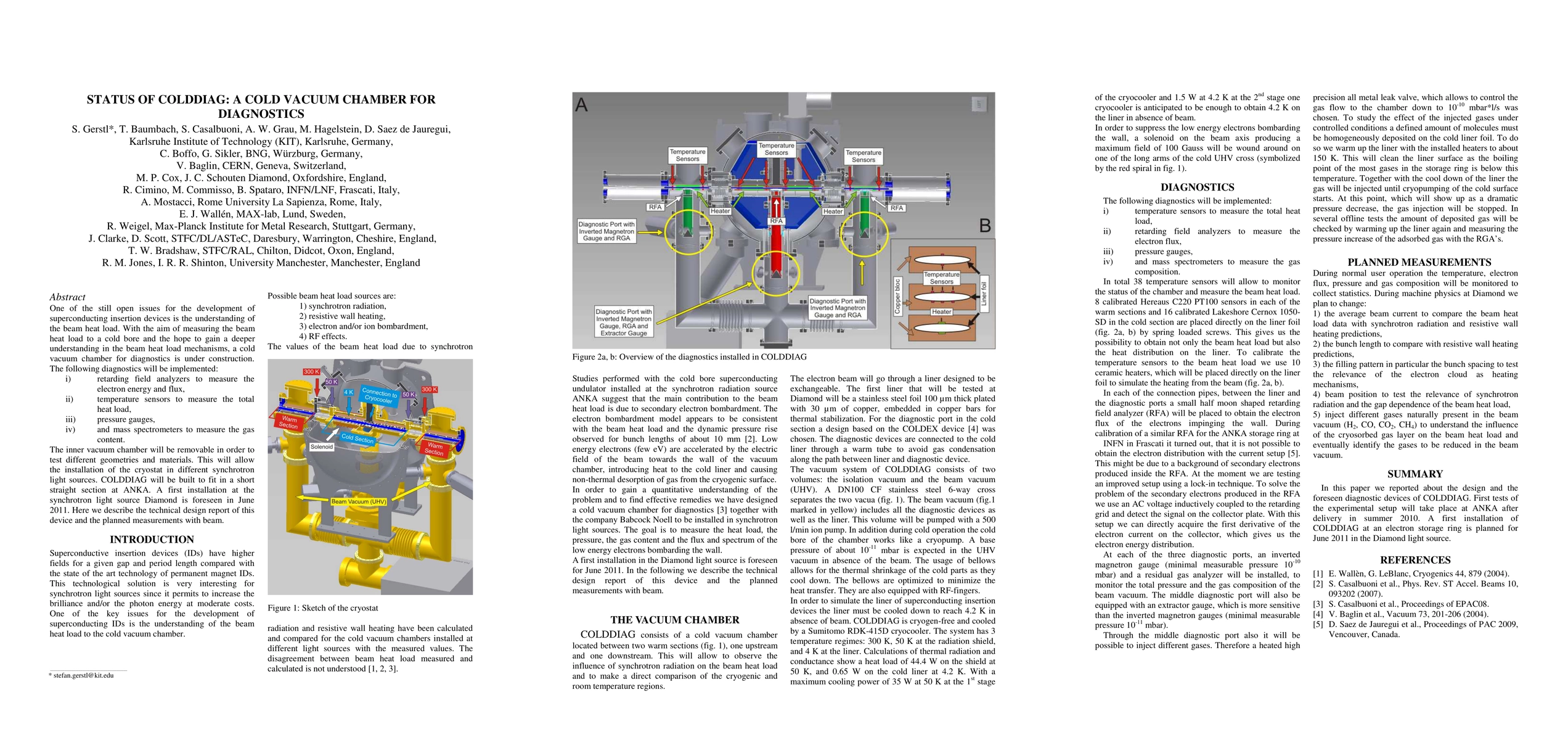 One of the still open issues for the development of superconducting insertion devices is the understanding of the beam heat load. With the aim of measuring the beam heat load to a cold bore and the hope to gain a deeper understanding in the beam heat load mechanisms, a cold vacuum chamber for diagnostics is under construction. The following diagnostics will be implemented: i) retarding field analyzers to measure the electron energy and flux, ii) temperature sensors to measure the total heat load, iii) pressure gauges, iv) and mass spectrometers to measure the gas content. The inner vacuum chamber will be removable in order to test different geometries and materials. This will allow the installation of the cryostat in different synchrotron light sources. COLDDIAG will be built to fit in a short straight section at ANKA. A first installation at the synchrotron light source Diamond is foreseen in June 2011. Here we describe the technical design report of this device and the planned measurements with beam.