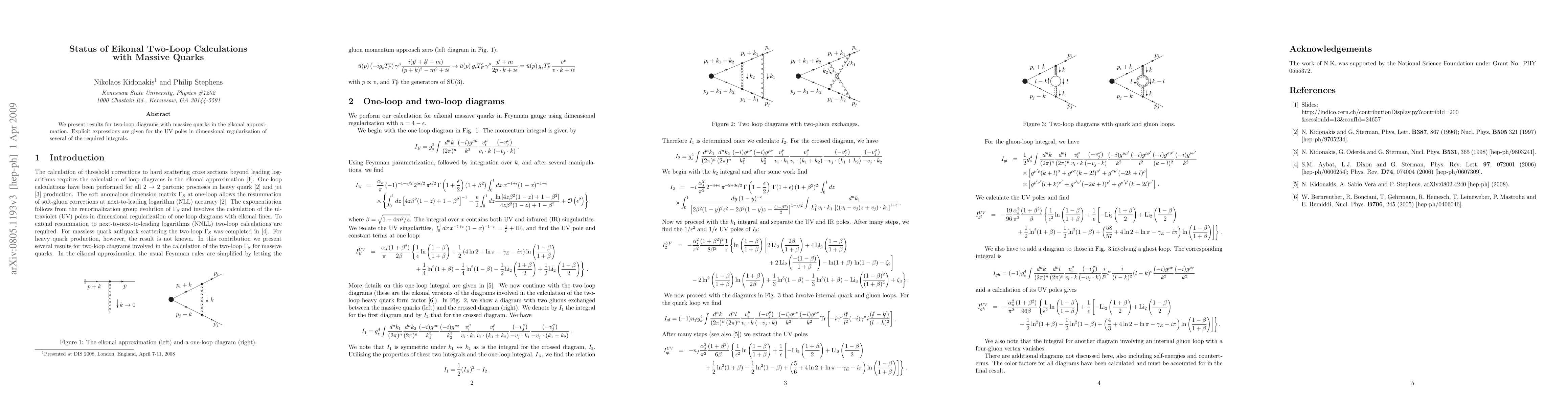We present results for two-loop diagrams with massive quarks in the eikonal approximation. Explicit expressions are given for the UV poles in dimensional regularization of several of the required integrals.