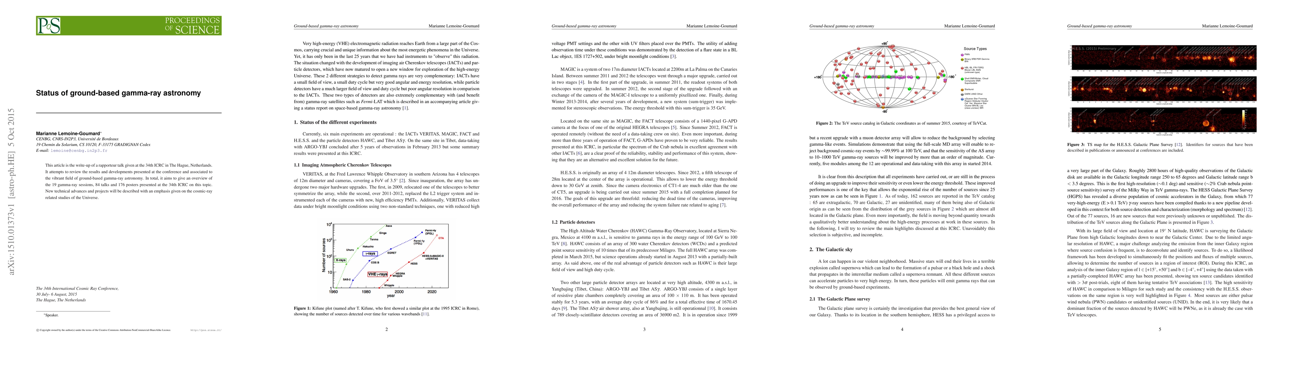 This article is the write-up of a rapporteur talk given at the 34th ICRC in The Hague, Netherlands. It attempts to review the results and developments presented at the conference and associated to the vibrant field of ground-based gamma-ray astronomy. In total, it aims to give an overview of the 19 gamma-ray sessions, 84 talks and 176 posters presented at the 34th ICRC on this topic. New technical advances and projects will be described with an emphasis given on the cosmic-ray related studies of the Universe.