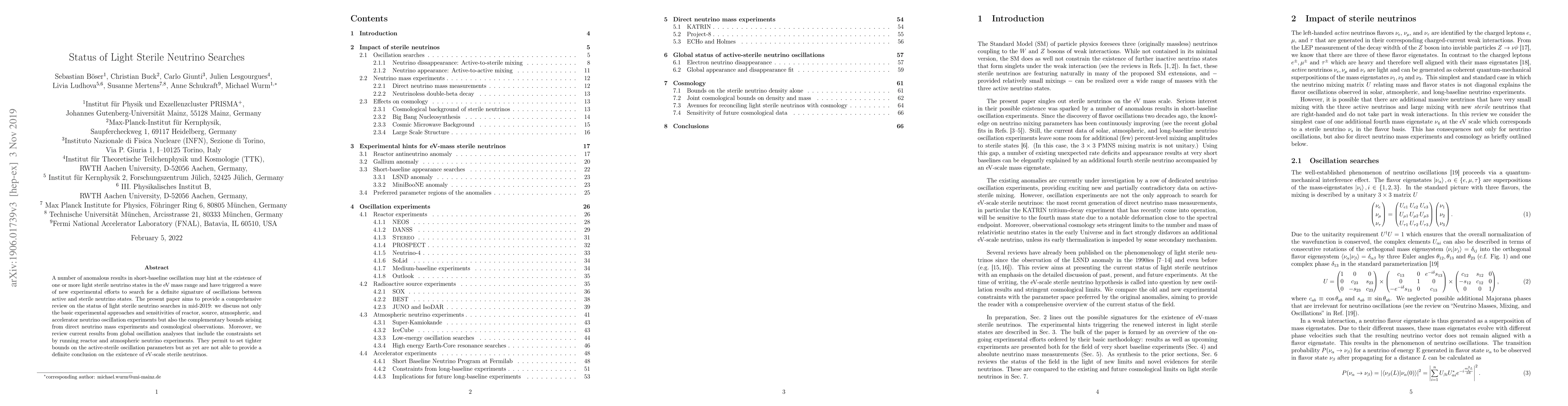 This paper provides a comprehensive review of the status of light sterile neutrino searches as of mid-2019, discussing experimental approaches and sensitivities across various neutrino oscillation experiments, as well as direct neutrino mass experiments and cosmological observations. While current results tighten constraints on active-sterile oscillation parameters, no definitive conclusion on the existence of eV-scale sterile neutrinos has been reached.