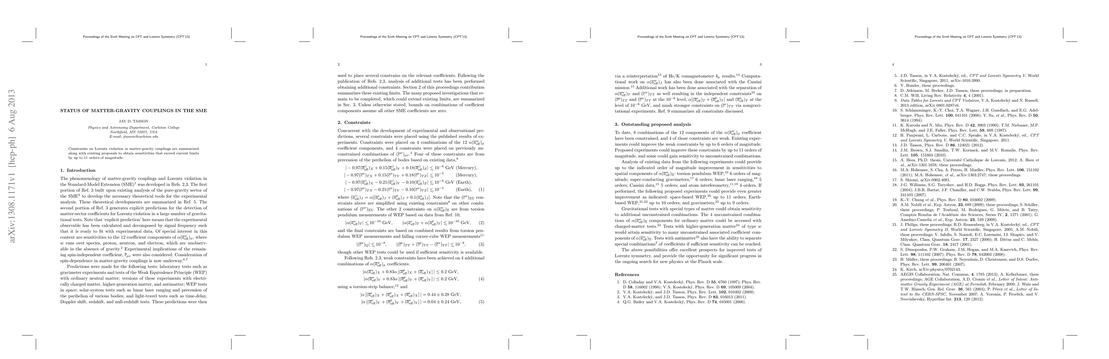 Constraints on Lorentz violation in matter-gravity couplings are summarized along with existing proposals to obtain sensitivities that exceed current limits by up to 11 orders of magnitude.