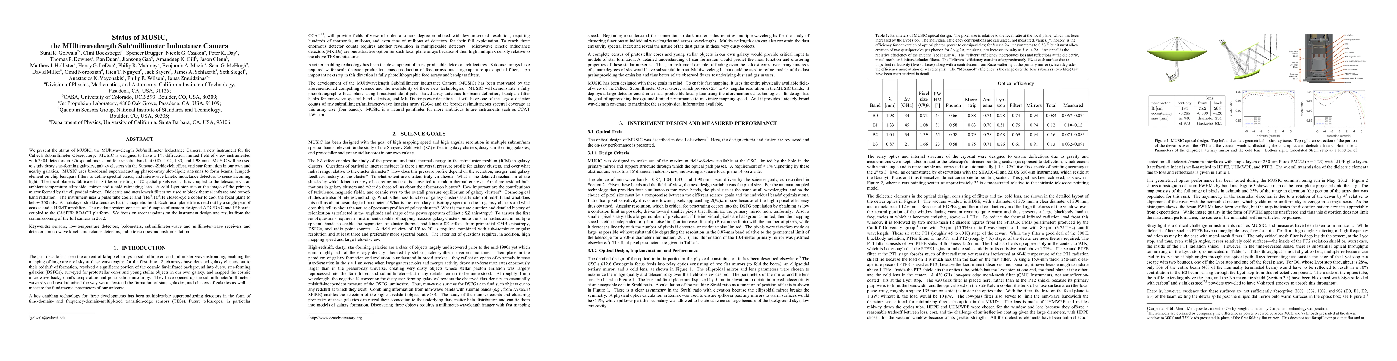 We present the status of MUSIC, the MUltiwavelength Sub/millimeter Inductance Camera, a new instrument for the Caltech Submillimeter Observatory. MUSIC is designed to have a 14', diffraction-limited field-of-view instrumented with 2304 detectors in 576 spatial pixels and four spectral bands at 0.87, 1.04, 1.33, and 1.98 mm. MUSIC will be used to study dusty star-forming galaxies, galaxy clusters via the Sunyaev-Zeldovich effect, and star formation in our own and nearby galaxies. MUSIC uses broadband superconducting phased-array slot-dipole antennas to form beams, lumped-element on-chip bandpass filters to define spectral bands, and microwave kinetic inductance detectors to senseincoming light. The focal plane is fabricated in 8 tiles consisting of 72 spatial pixels each. It is coupled to the telescope via an ambient temperature ellipsoidal mirror and a cold reimaging lens. A cold Lyot stop sits at the image of the primary mirror formed by the ellipsoidal mirror. Dielectric and metal mesh filters are used to block thermal infrared and out-of-band radiation. The instrument uses a pulse tube cooler and 3He/3He/4He closed-cycle cooler to cool the focal plane to below 250 mK. A multilayer shield attenuates Earth's magnetic field. Each focal plane tile is read out by a single pair of coaxes and a HEMT amplifier. The readout system consists of 16 copies of custom-designed ADC/DAC and IF boards coupled to the CASPER ROACH platform. We focus on recent updates on the instrument design and results from the commissioning of the full camera in 2012.