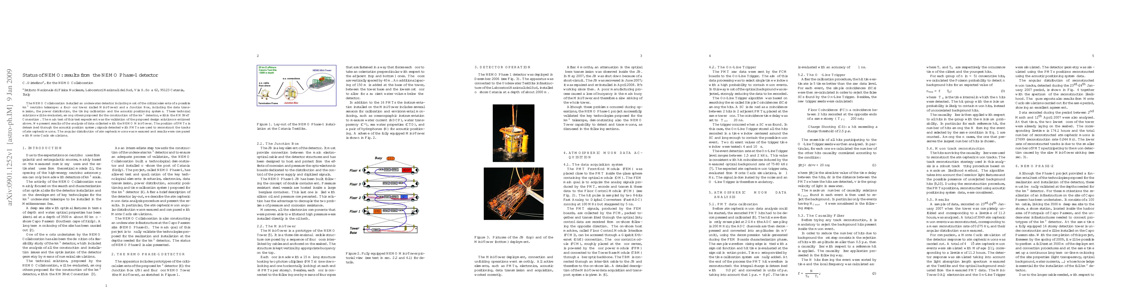The NEMO Collaboration installed an underwater detector including most of the critical elements of a possible km$^3$ neutrino telescope: a four-floor tower (called Mini-Tower) and a Junction Box, including the data transmission, the power distribution, the timing calibration and the acoustic positioning systems. These technical solutions will be evaluated, among others proposed for the construction of the km$^3$ detector, within the KM3NeT Consortium. The main test of this test experiment was the validation of the proposed design solutions mentioned above. We present results of the analysis of data collected with the NEMO Mini-Tower. The position of PMTs is determined through the acoustic position system; signals detected with PMTs are used to reconstruct the tracks of atmospheric muons. The angular distribution of atmospheric muons was measured and results were compared with Monte Carlo simulations.