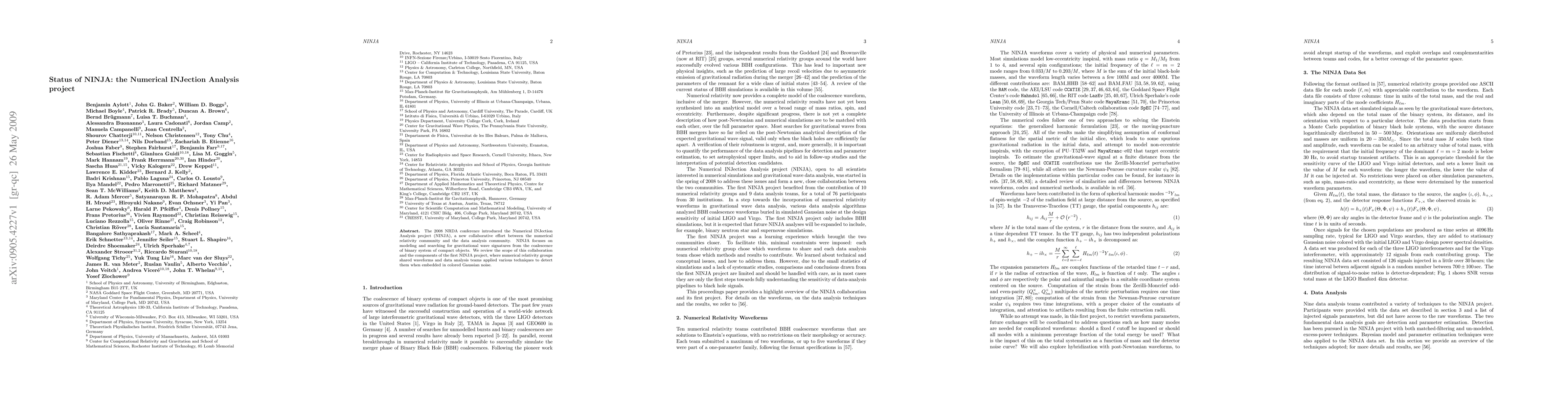 The NINJA project, initiated in 2008, unites numerical relativity and data analysis communities to model and detect gravitational wave signatures from binary compact object coalescence. The first project involved sharing waveforms from numerical relativity and applying detection techniques to noisy data.