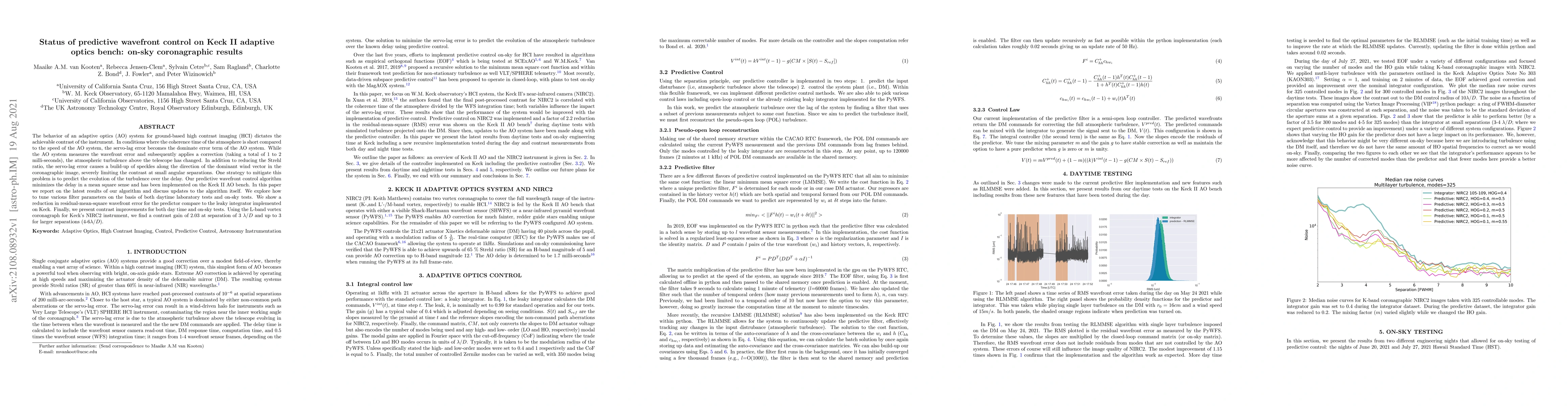 The behavior of an adaptive optics (AO) system for ground-based high contrast imaging (HCI) dictates the achievable contrast of the instrument. In conditions where the coherence time of the atmosphere is short compared to the speed of the AO system, the servo-lag error becomes the dominate error term of the AO system. While the AO system measures the wavefront error and subsequently applies a correction (taking a total of 1 to 2 milli-seconds), the atmospheric turbulence above the telescope has changed. In addition to reducing the Strehl ratio, the servo-lag error causes a build-up of speckles along the direction of the dominant wind vector in the coronagraphic image, severely limiting the contrast at small angular separations. One strategy to mitigate this problem is to predict the evolution of the turbulence over the delay. Our predictive wavefront control algorithm minimizes the delay in a mean square sense and has been implemented on the Keck II AO bench. In this paper we report on the latest results of our algorithm and discuss updates to the algorithm itself. We explore how to tune various filter parameters on the basis of both daytime laboratory tests and on-sky tests. We show a reduction in residual-mean-square wavefront error for the predictor compare to the leaky integrator implemented on Keck. Finally, we present contrast improvements for both day time and on-sky tests. Using the L-band vortex coronagraph for Keck's NIRC2 instrument, we find a contrast gain of 2.03 at separation of 3~$\lambda/D$ and up to 3 for larger separations (4-6~$\lambda/D$).