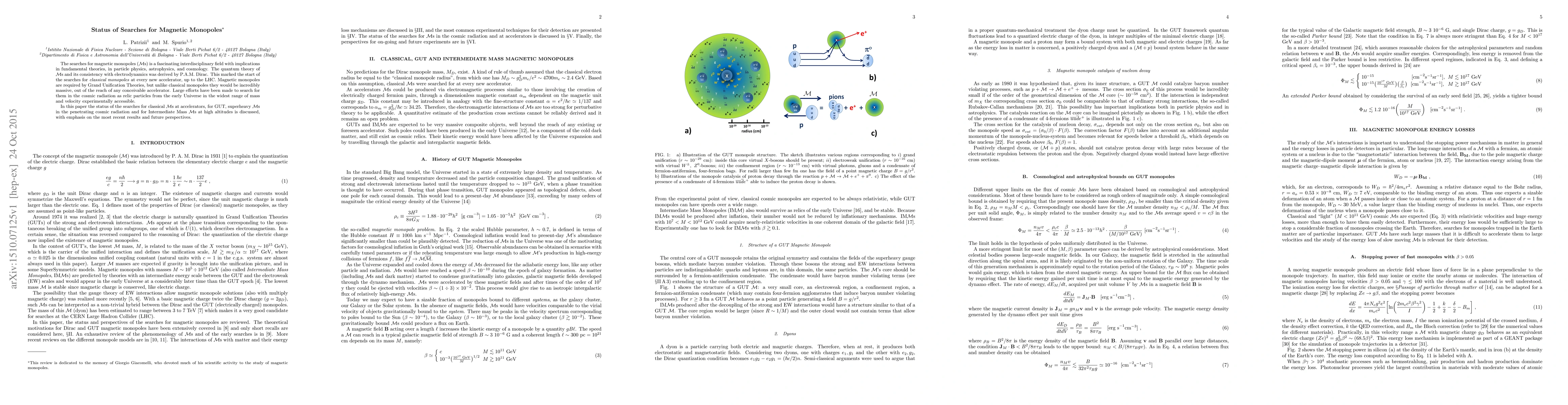 The searches for magnetic monopoles (Ms) is a fascinating interdisciplinary field with implications in fundamental theories, in particle physics, astrophysics, and cosmology. The quantum theory of Ms and its consistency with electrodynamics was derived by Dirac. This marked the start of the searches for classical monopoles at every new accelerator, up to the LHC. Magnetic monopoles are required by Grand Unification Theories, but unlike classical monopoles they would be incredibly massive, out of the reach of any conceivable accelerator. Large efforts have been made to search for them in the cosmic radiation as relic particles from the early Universe in the widest range of mass and velocity experimentally accessible. In this paper the status of the searches for classical Ms at accelerators, for GUT, superheavy Ms in the penetrating cosmic radiation and for Intermediate Mass Ms at high altitudes is discussed, with emphasis on the most recent results and future perspectives.