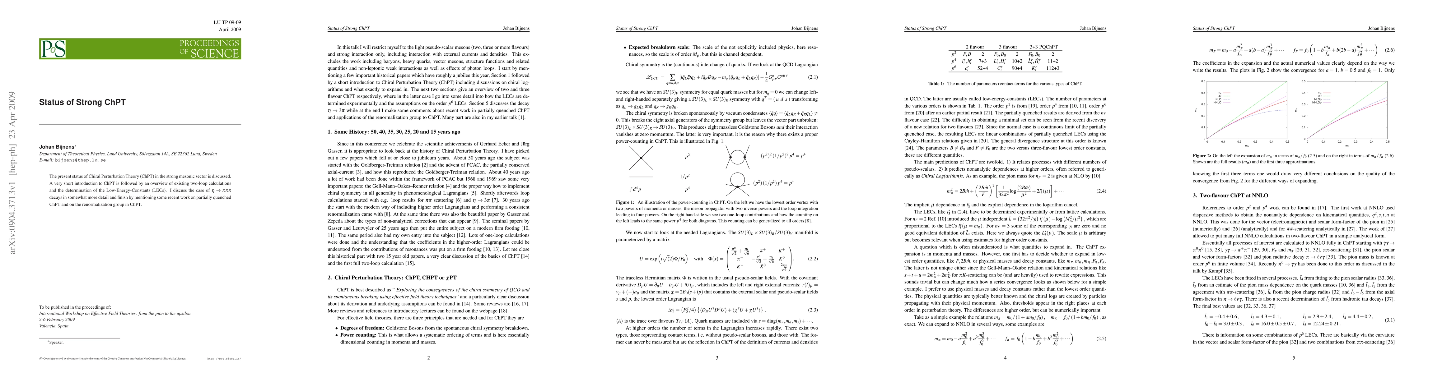 This paper reviews the current state of Chiral Perturbation Theory (ChPT) in the strong mesonic sector, highlighting recent two-loop calculations and the determination of Low-Energy-Constants (LECs), with a focus on $\eta\to\pi\pi\pi$ decays and mentions of partially quenched ChPT and its renormalization group aspects.