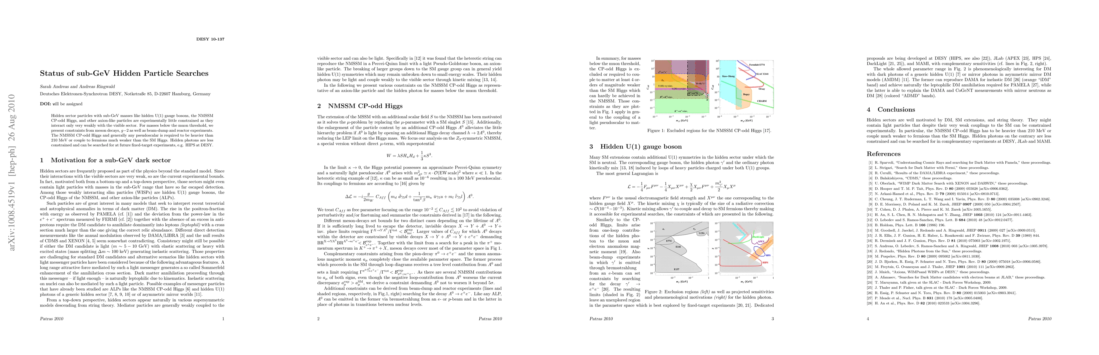 Hidden sector particles with sub-GeV masses like hidden U(1) gauge bosons, the NMSSM CP-odd Higgs, and other axion-like particles are experimentally little constrained as they interact only very weakly with the visible sector. For masses below the muon threshold, we present constraints from meson decays, g - 2 as well as beam-dump and reactor experiments. The NMSSM CP-odd Higgs and generally any pseudoscalar is required to be heavier than 210 MeV or couple to fermions much weaker than the SM Higgs. Hidden photons are less constrained and can be searched for at future fixed-target experiments, e.g. HIPS at DESY.