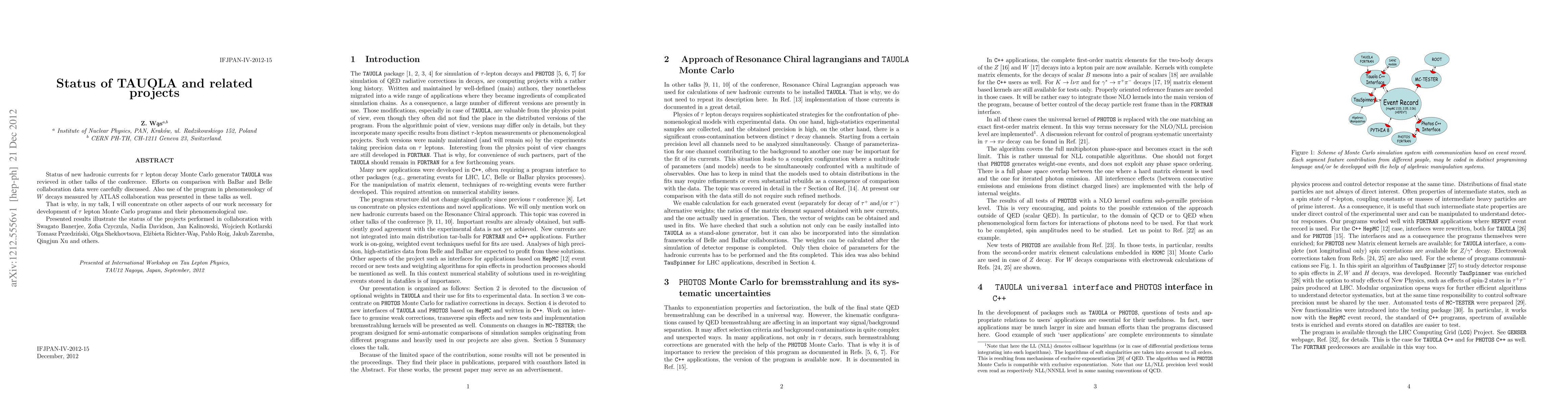 Status of new hadronic currents for tau lepton decay Monte Carlo generator TAUOLA was revieved in other talks of the conference. Efforts on comparison with BaBar and Belle collaboration data were carefully discussed. Also use of the program in phenomenology of W decays measured by ATLAS collaboration was presented in these talks as well. That is why, in my talk, I will concentrate on other aspects of our work necessary for development of tau lepton Monte Carlo programs and their phenomenological use. Presented results illustrate the status of the projects performed in collaboration with Swagato Banerjee, Zofia Czyczula, Nadia Davidson, Jan Kalinowski, Wojciech Kotlarski Tomasz Przedzinski, Olga Shekhovtsova, Elzbieta Richter-Was, Pablo Roig, Jakub Zaremba, Qingjun Xu and others.