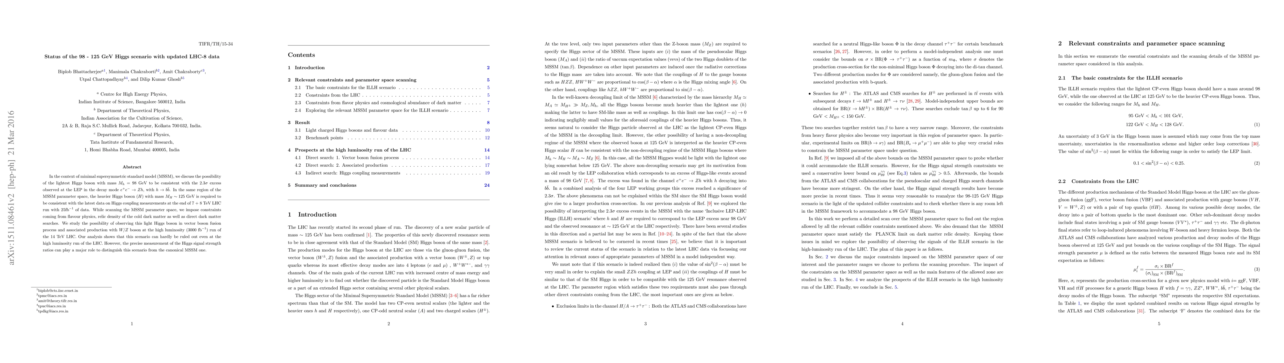 This paper examines the viability of the minimal supersymmetric standard model (MSSM) with a light Higgs boson ($M_h = 98$ GeV) consistent with LEP data and a heavier Higgs boson ($M_H \sim 125$ GeV) matching the latest LHC data. Despite stringent constraints from various sources, the scenario remains plausible even at higher LHC luminosities, with precise signal strength measurements crucial for distinguishing it from the standard MSSM.