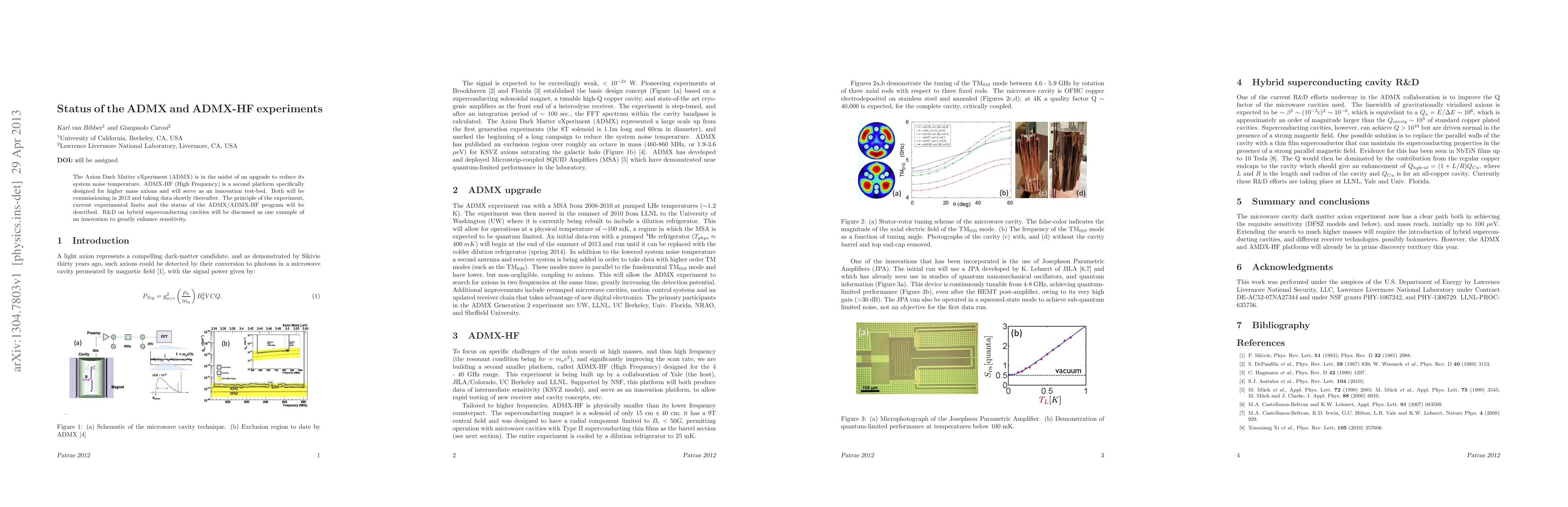 The ADMX experiment is undergoing an upgrade to lower its system noise temperature, while ADMX-HF aims to detect higher mass axions. Both are set to commission in 2013 and will explore innovative methods like hybrid superconducting cavities to enhance sensitivity.