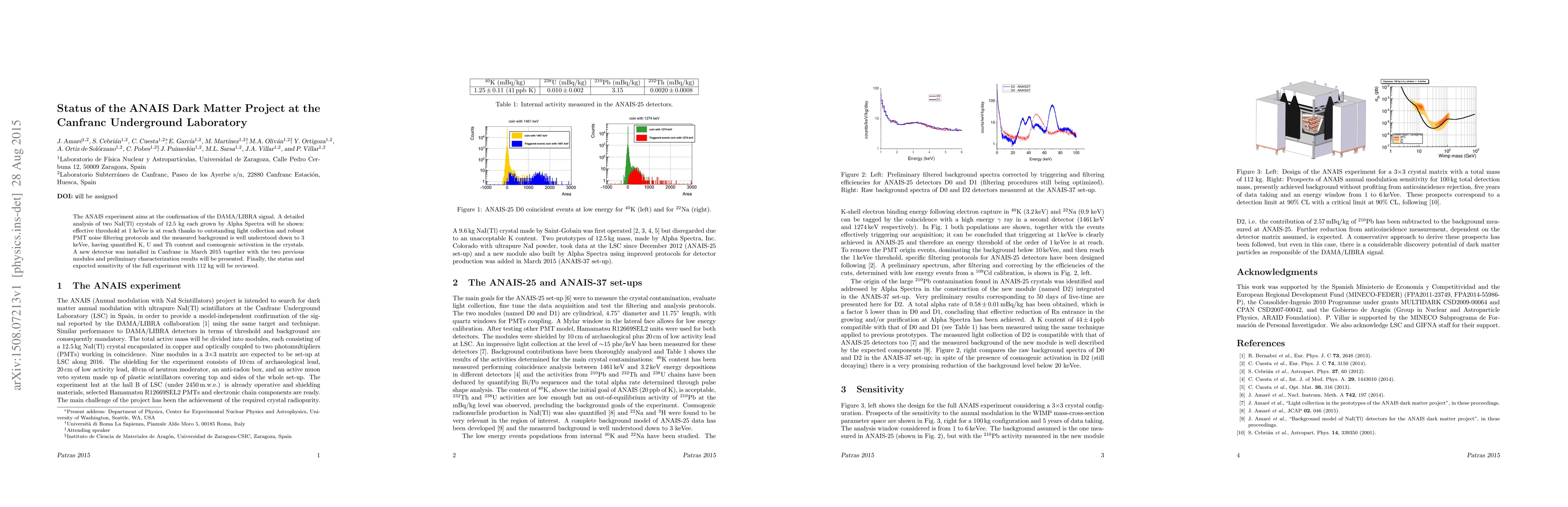 The ANAIS experiment seeks to confirm the DAMA/LIBRA dark matter signal using two 12.5 kg NaI(Tl) crystals, achieving an effective threshold of 1 keVee through advanced light collection and noise filtering. Preliminary results from a new detector installed in 2015 show promising background understanding down to 3 keVee, with detailed quantification of K, U, and Th content. The full experiment, with a total of 112 kg, is reviewed for its anticipated sensitivity.