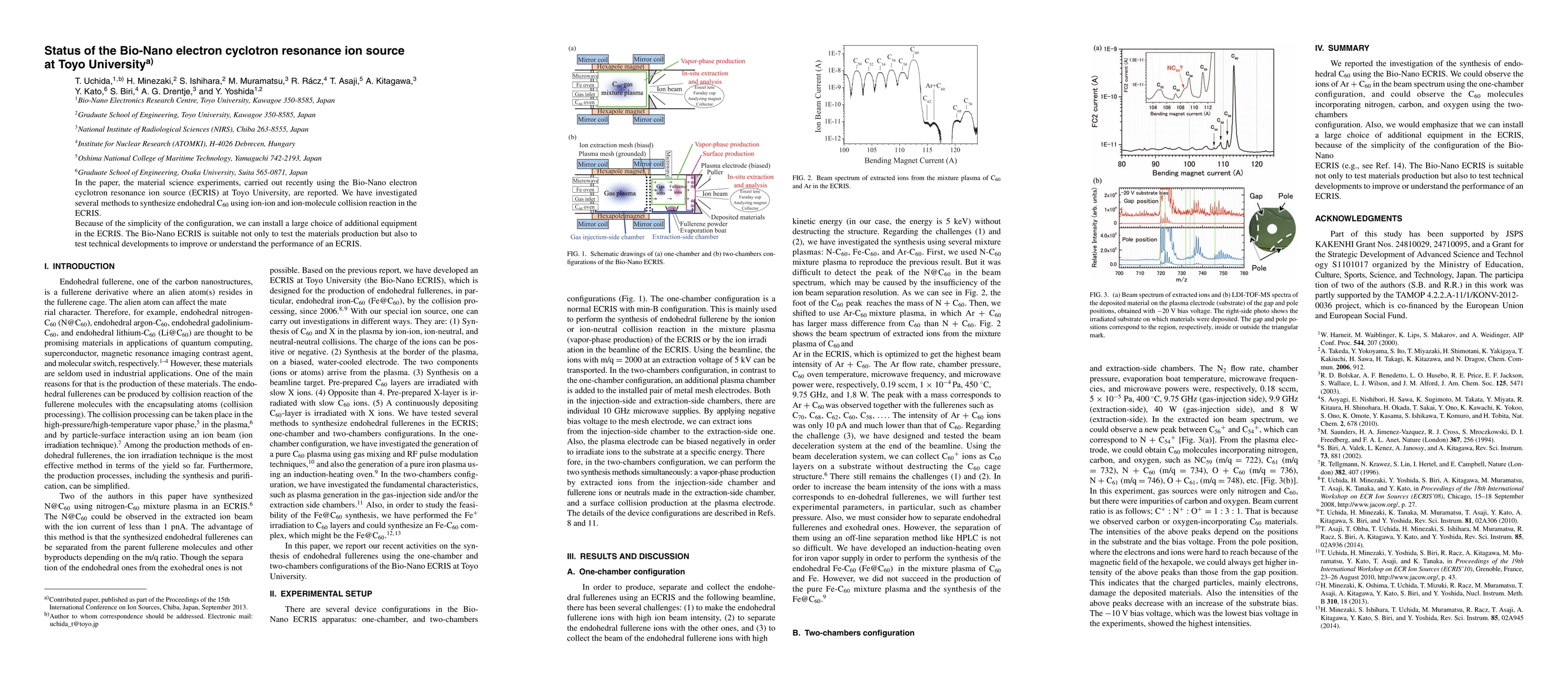 This paper reports on recent material science experiments using Toyo University's Bio-Nano electron cyclotron resonance ion source (ECRIS) to synthesize endohedral C60 via ion-ion and ion-molecule collisions. The ECRIS's versatile configuration allows for various technical developments and material production tests.