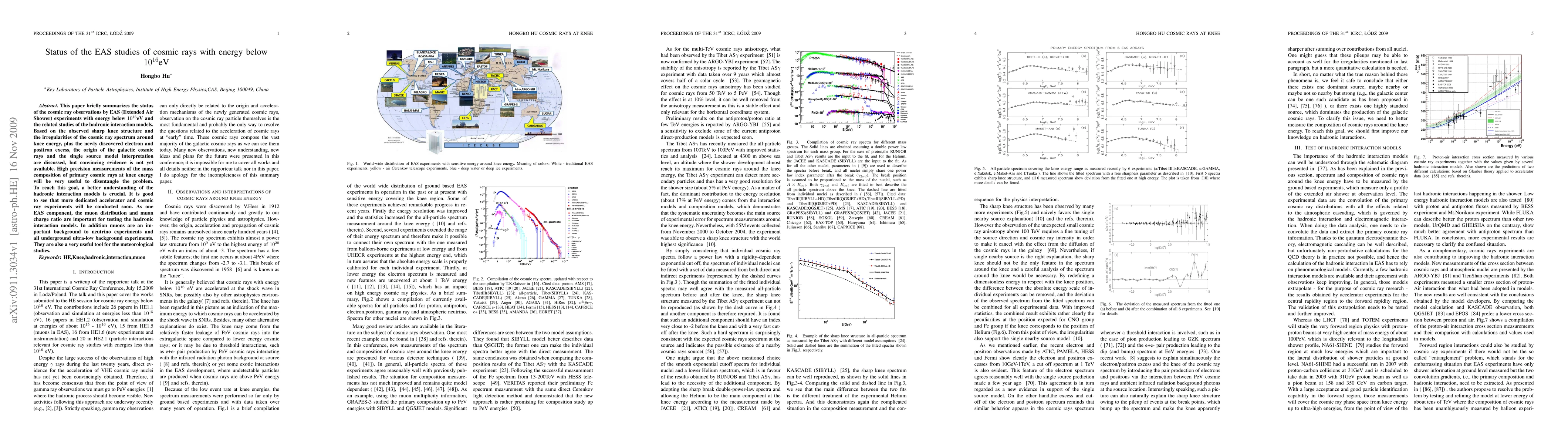 This paper briefly summarizes the status of the cosmic ray observations by EAS (Extended Air Shower) experiments with energy below 10**16eV and the related studies of the hadronic interaction models. Based on the observed sharp knee structure and the irregularities of the cosmic ray spectrum around knee energy, plus the newly discovered electron and positron excess, the origin of the galactic cosmic rays and the single source model interpretation are discussed, but convincing evidence is not yet available. High precision measurements of the mass composition of primary cosmic rays at knee energy will be very useful to disentangle the problem. To reach this goal, a better understanding of the hadronic interaction models is crucial. It is good to see that more dedicated accelerator and cosmic ray experiments will be conducted soon. As one EAS component, the muon distribution and muon charge ratio are important for testing the hadronic interaction models. In addition muons are an important background to neutrino experiments and all underground ultra-low background experiments. They are also a very useful tool for the meteorological studies.