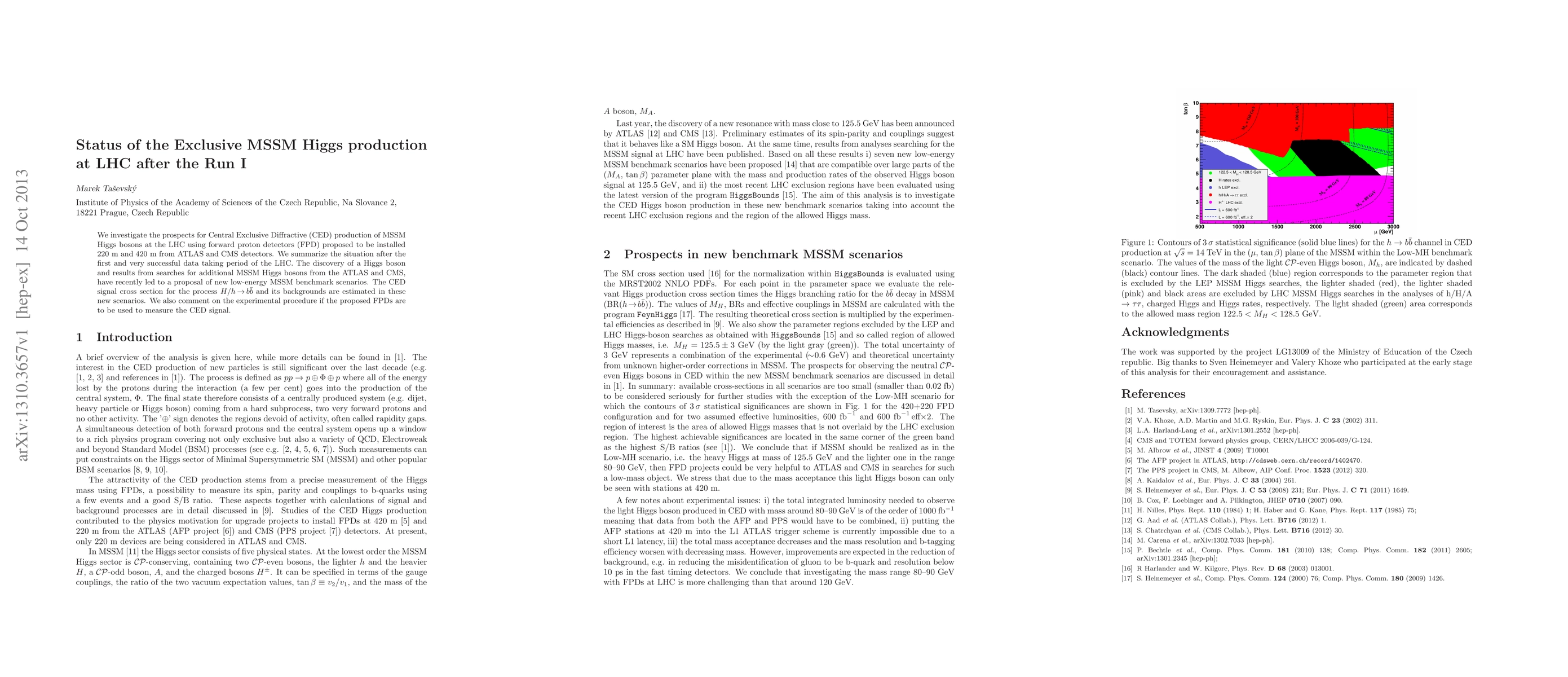 This paper assesses the prospects for Central Exclusive Diffractive production of MSSM Higgs bosons at the LHC, utilizing forward proton detectors, and evaluates the situation post-Run I, considering new low-energy MSSM benchmark scenarios and the estimated signal cross sections for the H -> bb process. The study also discusses the experimental setup for employing proposed FPDs to measure the diffractive signal.