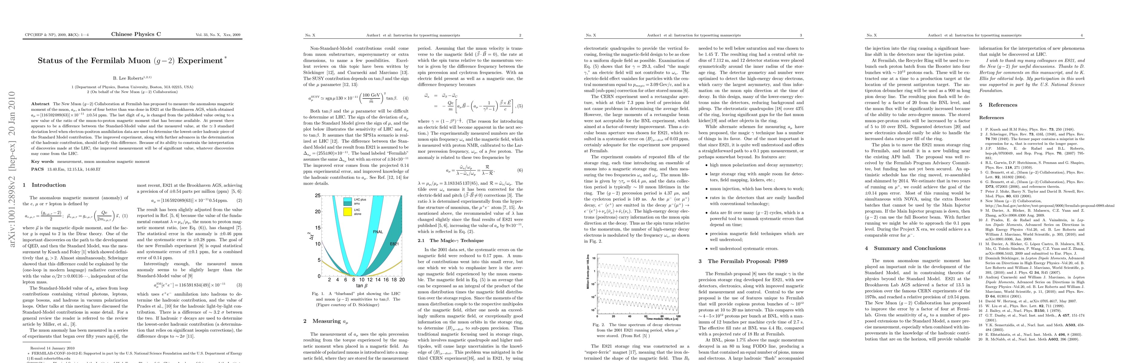 The New Muon $(g-2)$ Collaboration at Fermilab has proposed to measure the anomalous magnetic moment of the muon, $a_\mu$, a factor of four better than was done in E821 at the Brookhaven AGS, which obtained $a_\mu = [116 592 089 (63)] \times 10^{-11}$ $\pm 0.54$ ppm. The last digit of $a_{\mu}$ is changed from the published value owing to a new value of the ratio of the muon-to-proton magnetic moment that has become available. At present there appears to be a difference between the Standard-Model value and the measured value, at the $\simeq 3$ standard deviation level when electron-positron annihilation data are used to determine the lowest-order hadronic piece of the Standard Model contribution. The improved experiment, along with further advances in the determination of the hadronic contribution, should clarify this difference. Because of its ability to constrain the interpretation of discoveries made at the LHC, the improved measurement will be of significant value, whatever discoveries may come from the LHC.