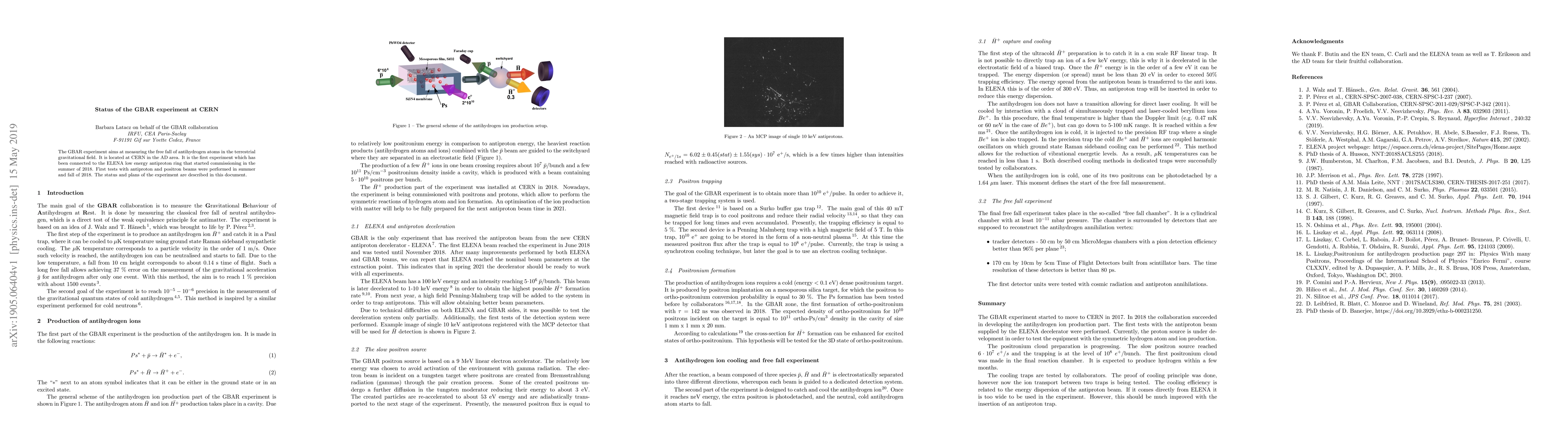 The GBAR experiment at CERN aims to measure the free fall of antihydrogen atoms, utilizing the ELENA low energy antiproton ring, with initial tests conducted in 2018. This document outlines the current status and future plans of the experiment.