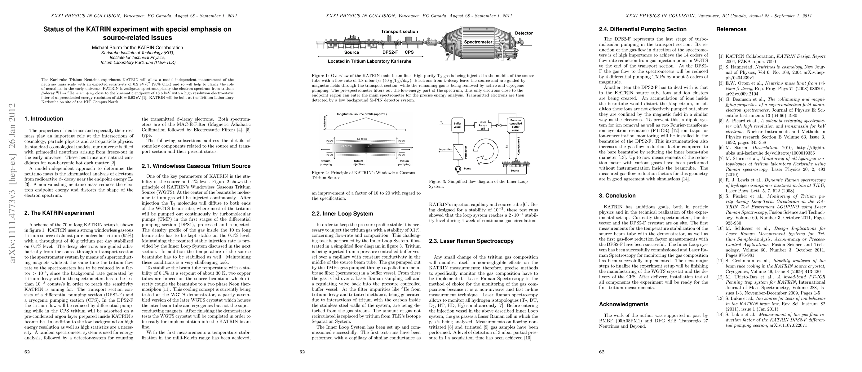 The Karlsruhe Tritium Neutrino experiment KATRIN will allow a model independent measurement of the neutrino mass scale with an expected sensitivity of 0.2 eV/c^{2} (90% C.L.) and so will help to clarify the role of neutrinos in the early universe is the direct measurement of the mass of the electron anti-neutrino. KATRIN investigates spectroscopically the electron spectrum from tritium beta- decay close to the kinematic endpoint of 18.6 keV with a high resolution electro-static filter of unprecedented energy resolution of 0.93 eV. KATRIN will be built at the Tritium Laboratory Karlsruhe on site of the KIT Campus North. For such a precise mass-determination a key parameter is the stability of the source in terms of beta-activity und isotopic purity. For that purpose KATRIN uses a strong windowless gaseous tritium source of almost pure molecular tritium (95%) with a throughput of 40 g tritium per day stabilized on 0.1% level. The decay electrons are guided adiabatically from the source to the spectrometer by means of superconducting magnets while at the same time the tritium flow rate to the spectrometers has to be reduced by a factor > 1E14. To reach the sensitivity KATRIN is aiming for, an high energy resolution as well as high statistics and low background are needed. A tandem spectrometer system is used for energy analysis. The transport section consists of a differential pumping system (DPS2-F) and a cryogenic pumping section (CPS). In the DPS2-F the tritium flow will be reduced by differential pumping while in the CPS tritium will be adsorbed on a pre-condensed argon layer prepared inside KATRIN's beamtube. To assure the required stability of the source on 0.1% level a stabilized tritium injection in the source is required. This is done by closed tritium loops. The purity and composition of the injected gas will be monitored by Laser Raman spectroscopy.