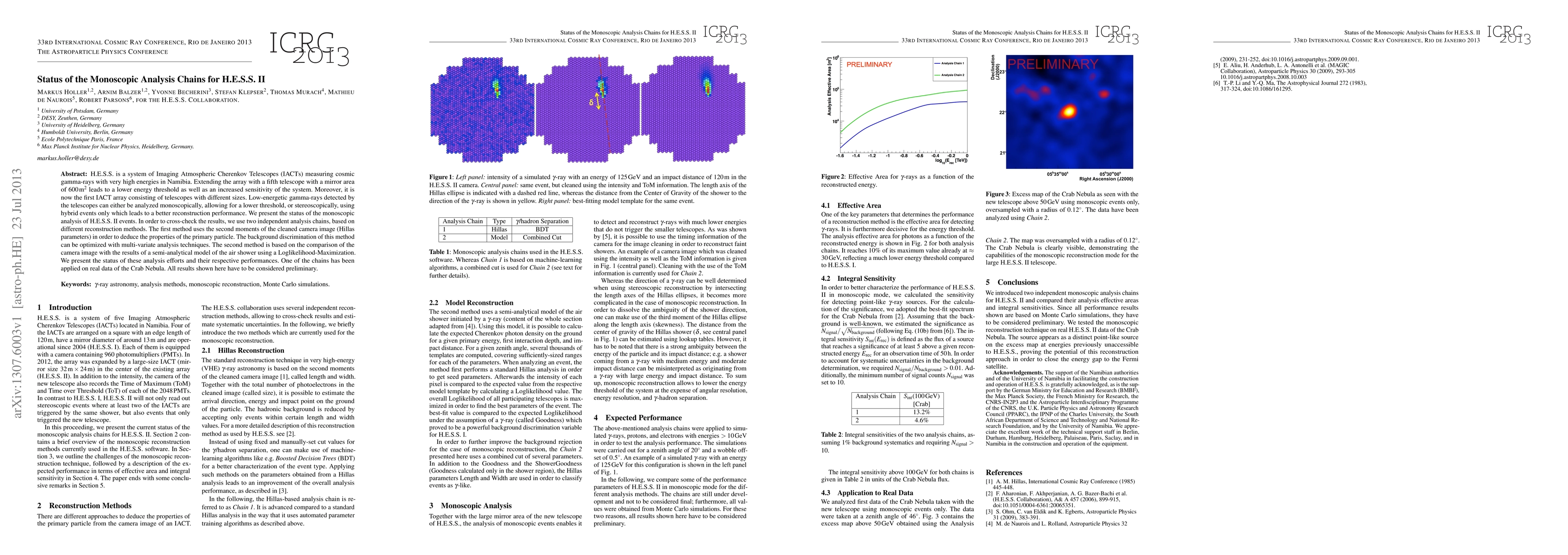 The paper discusses the current status of monoscopic analysis methods for H.E.S.S. II, an array of Imaging Atmospheric Cherenkov Telescopes in Namibia. It presents two independent analysis chains: one based on the second moments of the camera image and another using Loglikelihood-Maximization to compare images with a semi-analytical model. Preliminary results from the Crab Nebula have been obtained, though the findings remain preliminary.