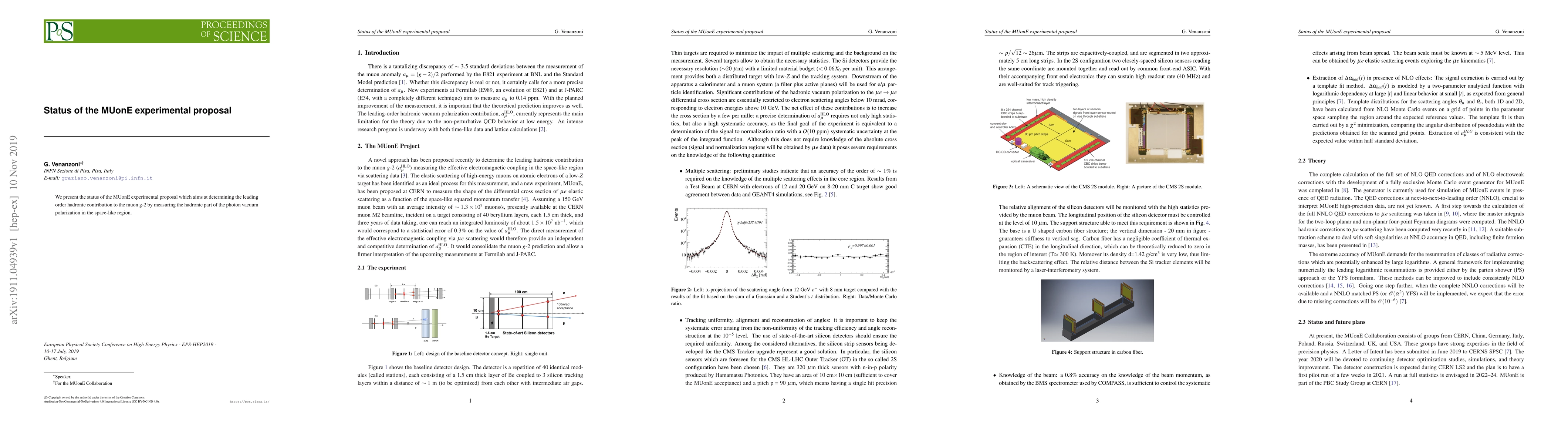 We present the status of the MUonE experimental proposal which aims at determining the leading order hadronic contribution to the muon g-2 by measuring the hadronic part of the photon vacuum polarization in the space-like region.