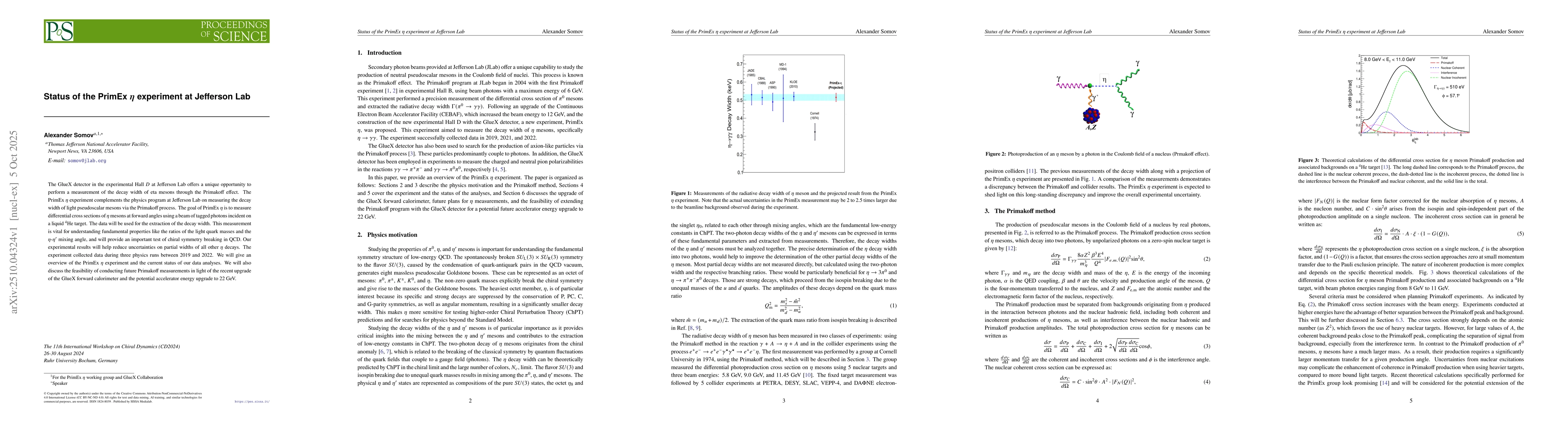 The PrimEx η experiment utilized the GlueX detector at Jefferson Lab to measure the differential cross sections of η mesons via the Primakoff effect using a liquid 4He target and tagged photon beams. Data were collected over three physics runs between 2019 and 2022, with analysis focusing on Compton scattering cross sections and η→γγ decay measurements.