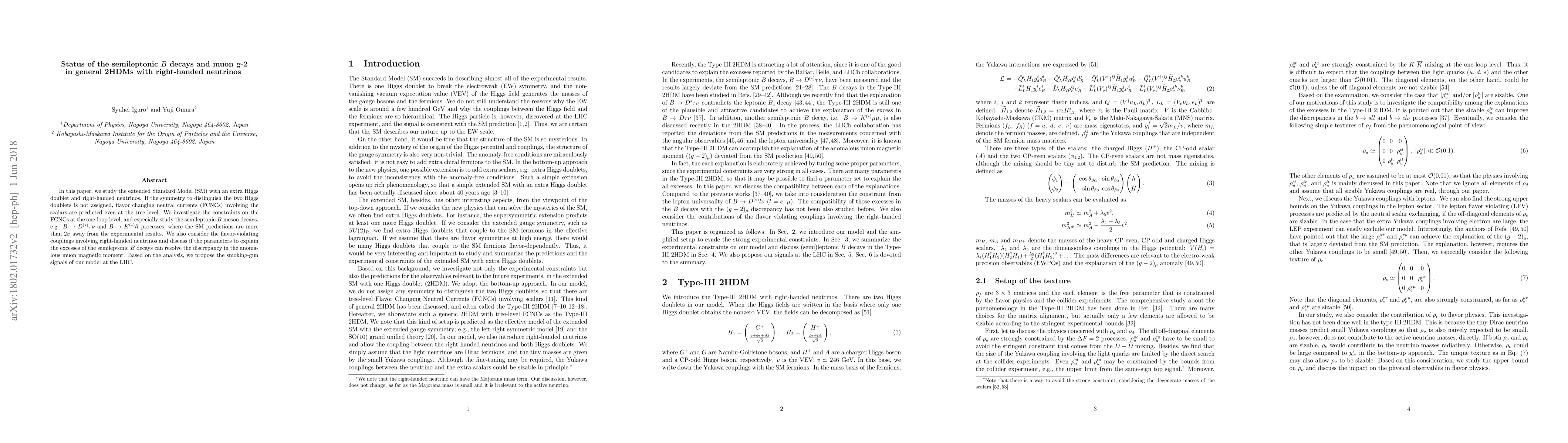 In this paper, we study the extended Standard Model (SM) with an extra Higgs doublet and right-handed neutrinos. If the symmetry to distinguish the two Higgs doublets is not assigned, flavor changing neutral currents (FCNCs) involving the scalars are predicted even at the tree level. We investigate the constraints on the FCNCs at the one-loop level, and especially study the semileptonic $B$ meson decays, e.g. $B \to D^{(*)} \tau \nu$ and $B \to K^{(*)} ll$ processes, where the SM predictions are more than $2 \sigma$ away from the experimental results. We also consider the flavor-violating couplings involving right-handed neutrinos and discuss if the parameters to explain the excesses of the semileptonic $B$ decays can resolve the discrepancy in the the anomalous muon magnetic moment. Based on the analysis, we propose the smoking-gun signals of our model at the LHC.
