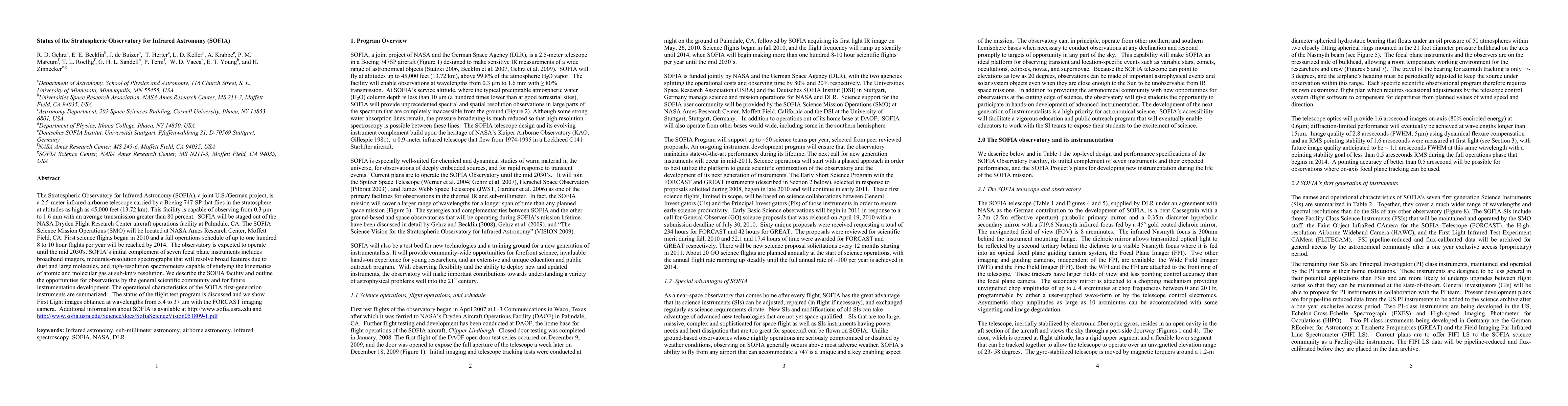 The Stratospheric Observatory for Infrared Astronomy (SOFIA), a U.S./German airborne telescope aboard a Boeing 747-SP, began science flights in 2010 and aims to conduct up to 100 flights annually by 2014, operating until the mid-2030s. SOFIA's initial instruments include broadband imagers and spectrometers for detailed molecular and atomic gas studies.