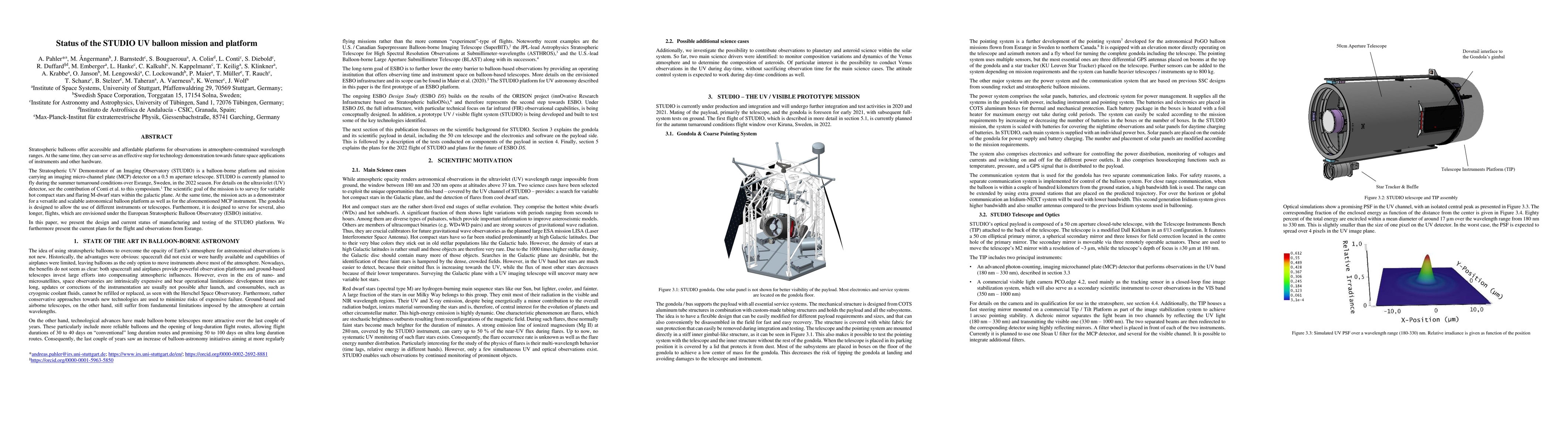 Stratospheric balloons offer accessible and affordable platforms for observations in atmosphere-constrained wavelength ranges. At the same time, they can serve as an effective step for technology demonstration towards future space applications of instruments and other hardware. The Stratospheric UV Demonstrator of an Imaging Observatory (STUDIO) is a balloon-borne platform and mission carrying an imaging micro-channel plate (MCP) detector on a 0.5 m aperture telescope. STUDIO is currently planned to fly during the summer turnaround conditions over Esrange, Sweden, in the 2022 season. For details on the ultraviolet (UV) detector, see the contribution of Conti et al. to this symposium. The scientific goal of the mission is to survey for variable hot compact stars and flaring M-dwarf stars within the galactic plane. At the same time, the mission acts as a demonstrator for a versatile and scalable astronomical balloon platform as well as for the aforementioned MCP instrument. The gondola is designed to allow the use of different instruments or telescopes. Furthermore, it is designed to serve for several, also longer, flights, which are envisioned under the European Stratospheric Balloon Observatory (ESBO) initiative. In this paper, we present the design and current status of manufacturing and testing of the STUDIO platform. We furthermore present the current plans for the flight and observations from Esrange.