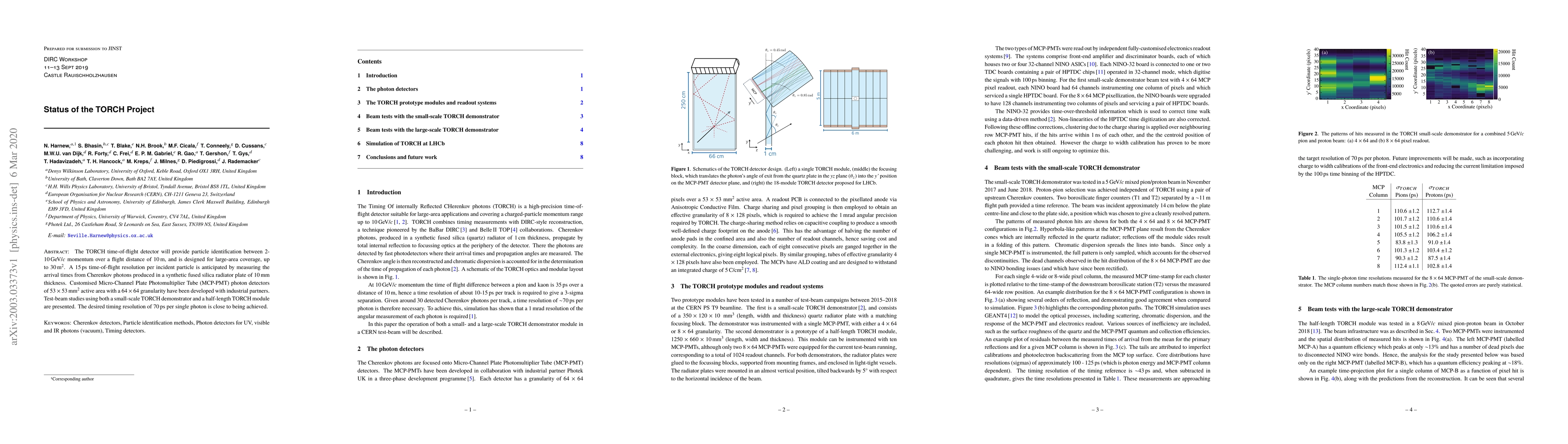 The TORCH project aims to develop a time-of-flight detector for particle identification over a 2-10 GeV/c momentum range using a synthetic fused silica radiator plate. Initial test-beam studies have nearly achieved the desired 70 ps timing resolution per photon.