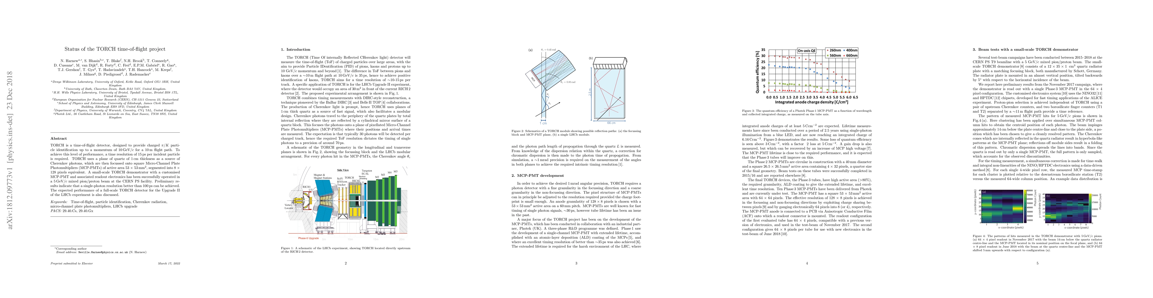 TORCH is a time-of-flight detector, designed to provide charged pi/K particle identification up to a momentum of 10 GeV/c for a 10 m flight path. To achieve this level of performance, a time resolution of 15 ps per incident particle is required. TORCH uses a plane of quartz of 1 cm thickness as a source of Cherenkov photons, which are then focussed onto square Micro-Channel Plate Photomultipliers (MCP-PMTs) of active area 53 x 53 mm^2, segmented into 8 x 128 pixels equivalent. A small-scale TORCH demonstrator with a customised MCP-PMT and associated readout electronics has been successfully operated in a 5 GeV/c mixed pion/proton beam at the CERN PS facility. Preliminary results indicate that a single-photon resolution better than 100 ps can be achieved. The expected performance of a full-scale TORCH detector for the Upgrade II of the LHCb experiment is also discussed.