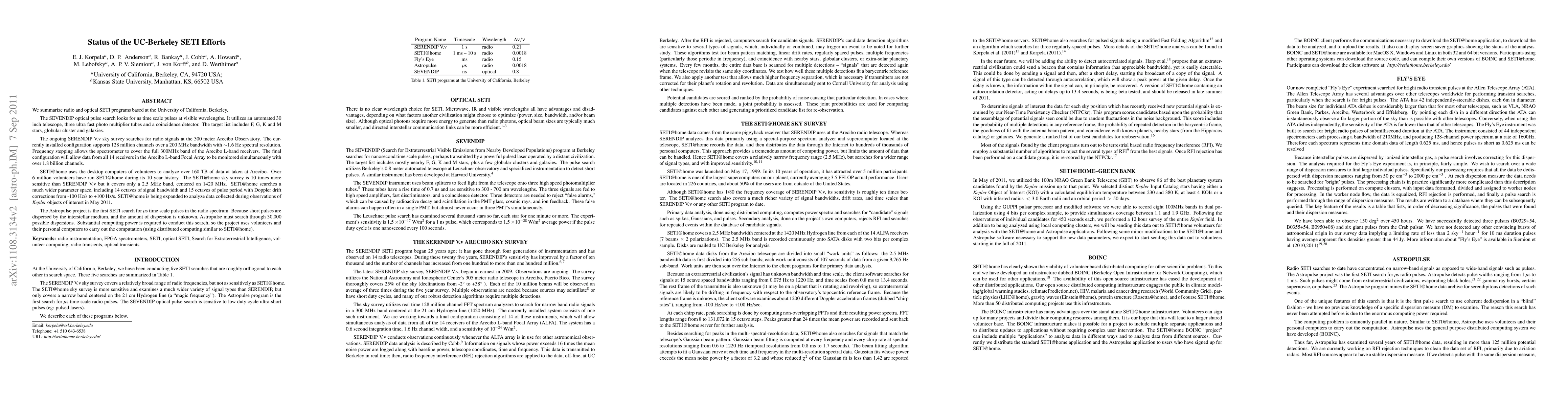 The UC-Berkeley SETI efforts encompass radio and optical search programs, including the SEVENDIP optical pulse search, SERENDIP V.v radio sky survey, and SETI@home volunteer computing project. The Astropulse project seeks microsecond dispersed pulses, with recent reobservations of previously detected signals.