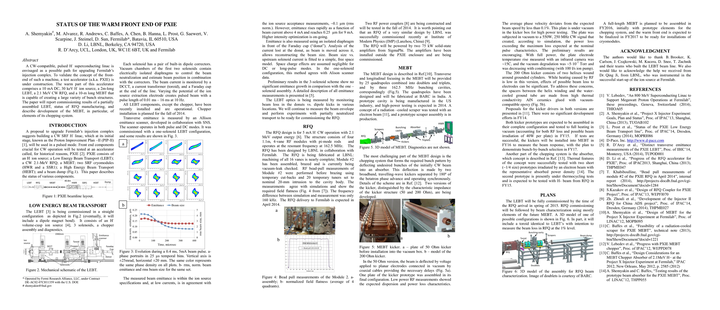 A CW-compatible, pulsed H- superconducting linac is envisaged as a possible path for upgrading Fermilab's injection complex. To validate the concept of the front- end of such a machine, a test accelerator (a.k.a. PXIE) is under construction. The warm part of this accelerator comprises a 10 mA DC, 30 keV H- ion source, a 2m-long LEBT, a 2.1 MeV CW RFQ, and a 10-m long MEBT that is capable of creating a large variety of bunch structures. The paper will report commissioning results of a partially assembled LEBT, status of RFQ manufacturing, and describe development of the MEBT, in particular, of elements of its chopping system.