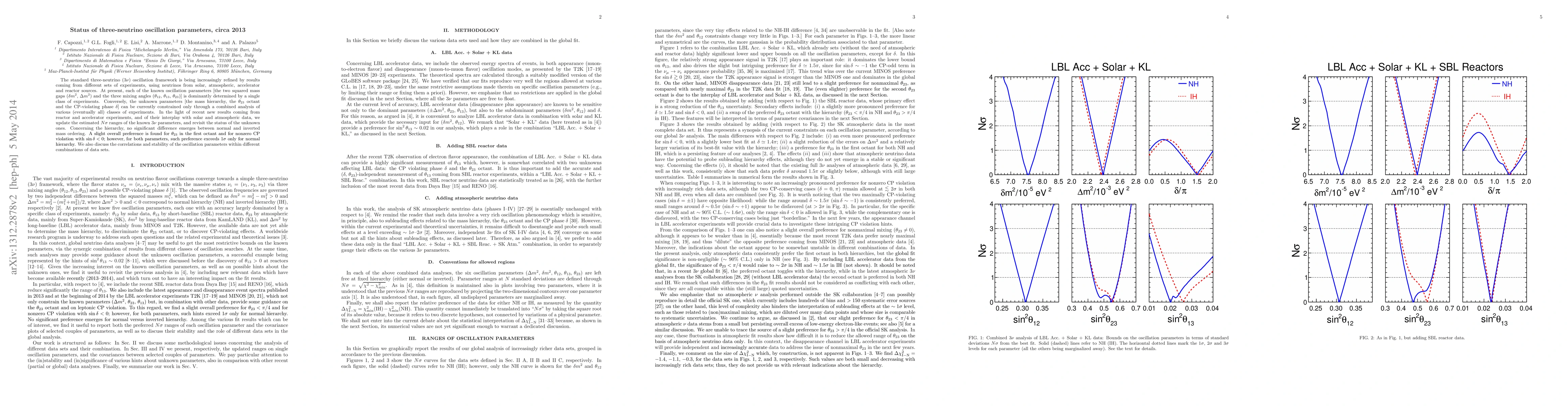 This paper updates the status of three-neutrino oscillation parameters in 2013, highlighting the refined estimates of known parameters from various experiments and discussing the constraints on unknown parameters like mass hierarchy and CP-violating phase, noting a slight preference for the first octant and normal hierarchy.