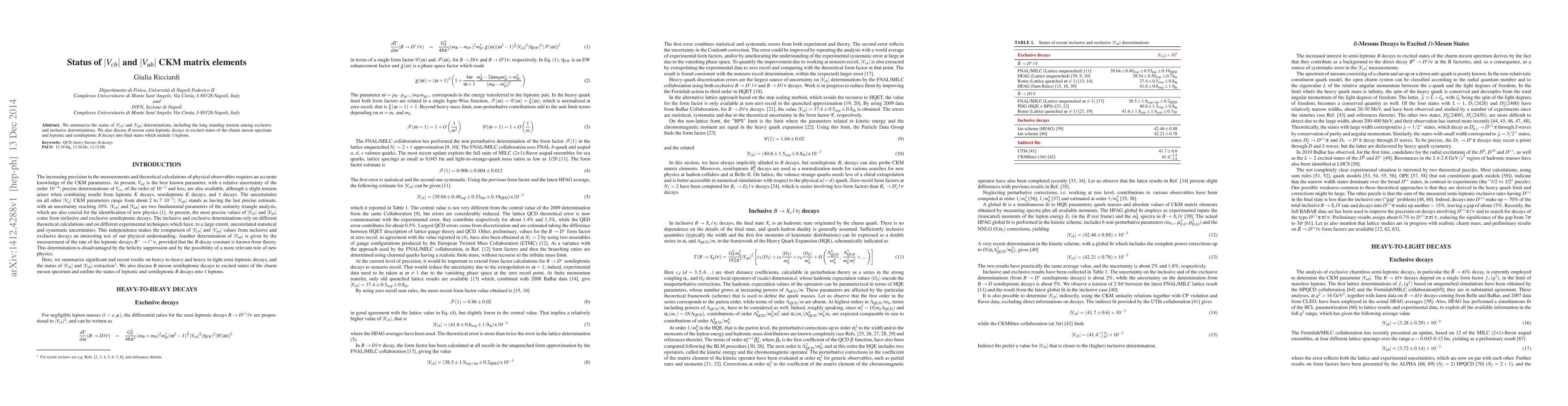 We summarize the status of $|V_{cb}|$ and $|V_{ub}|$ determinations, including the long standing tension among exclusive and inclusive determinations. We also discuss $B$ meson semileptonic decays to excited states of the charm meson spectrum and leptonic and semileptonic $B$ decays into final states which include $\tau$ leptons.